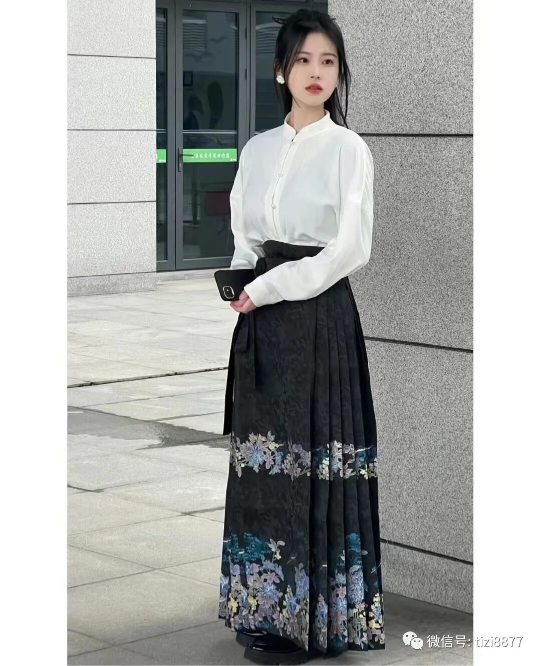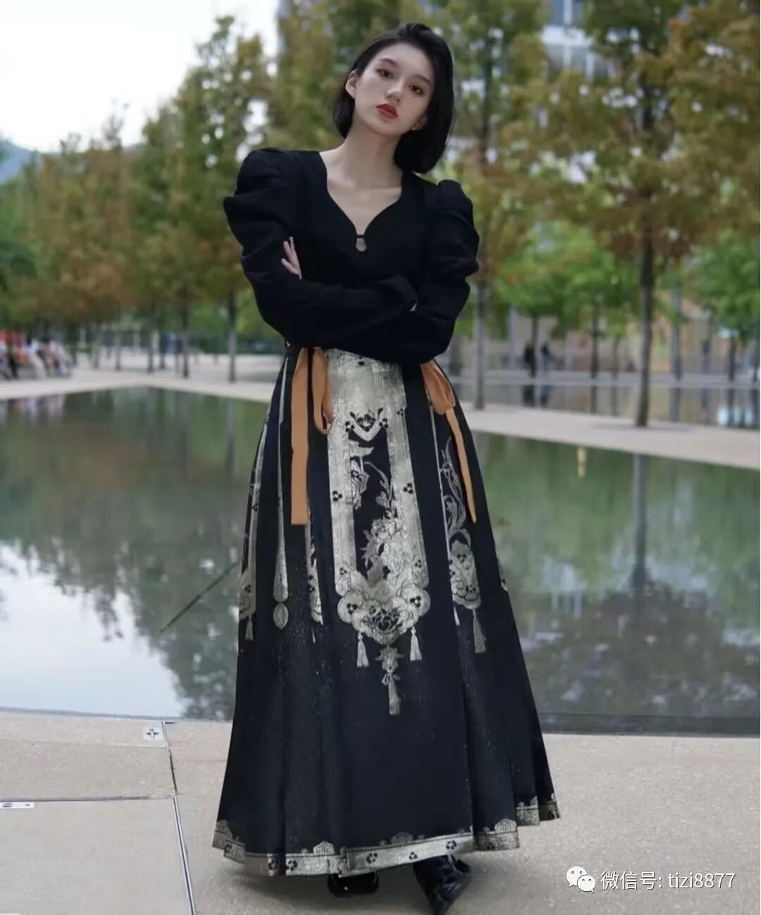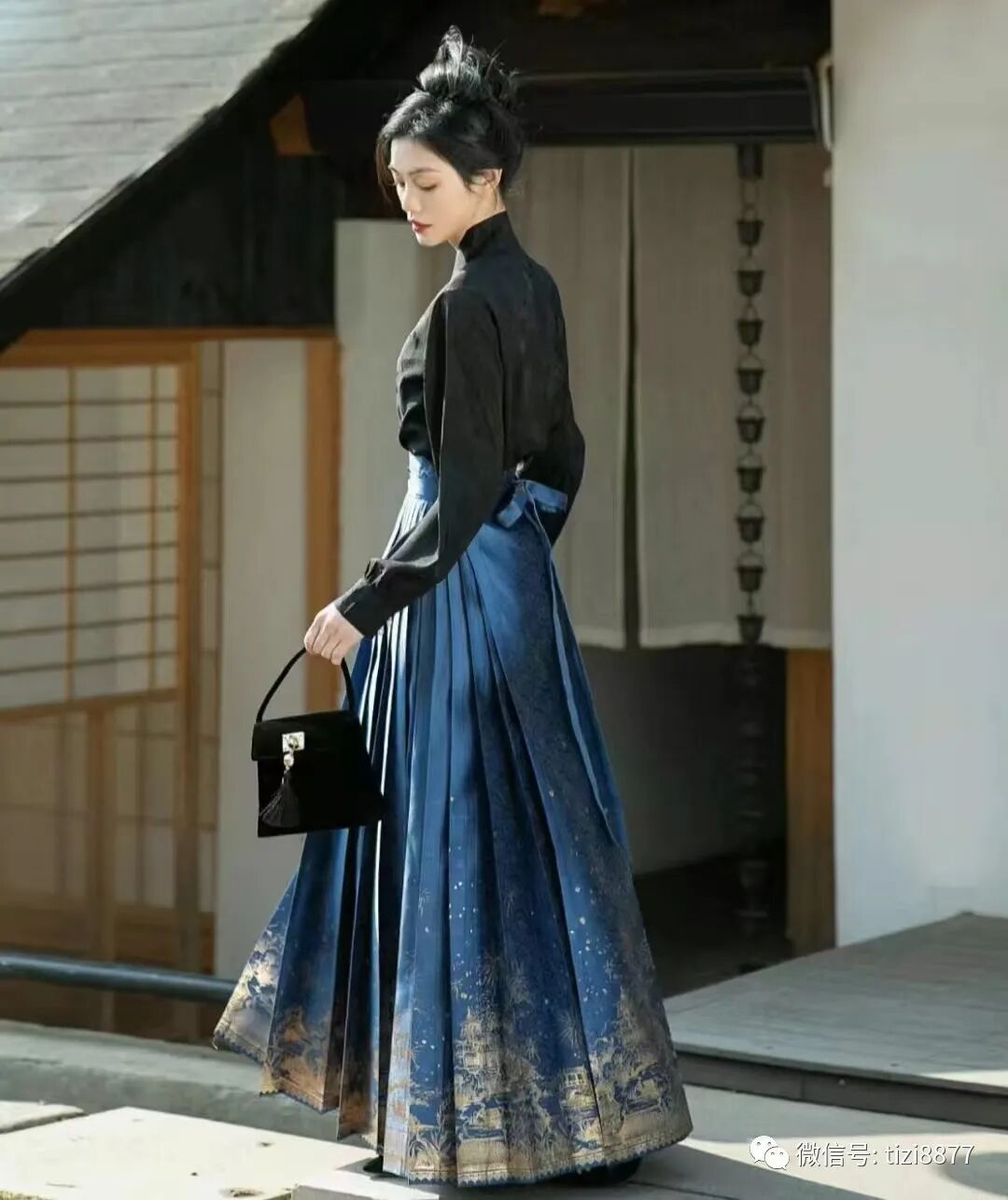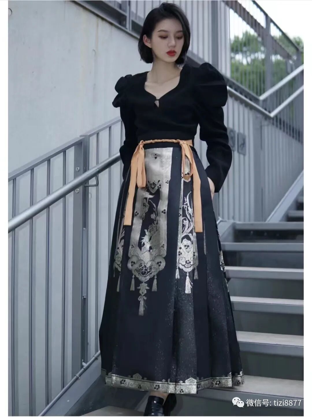 黑色襯衫配馬面裙真的好高級(jí)!黑襯衫+黑馬面裙這一身,搭配真的好酷,黑藍(lán)和黑紅搭配意外的很好看。