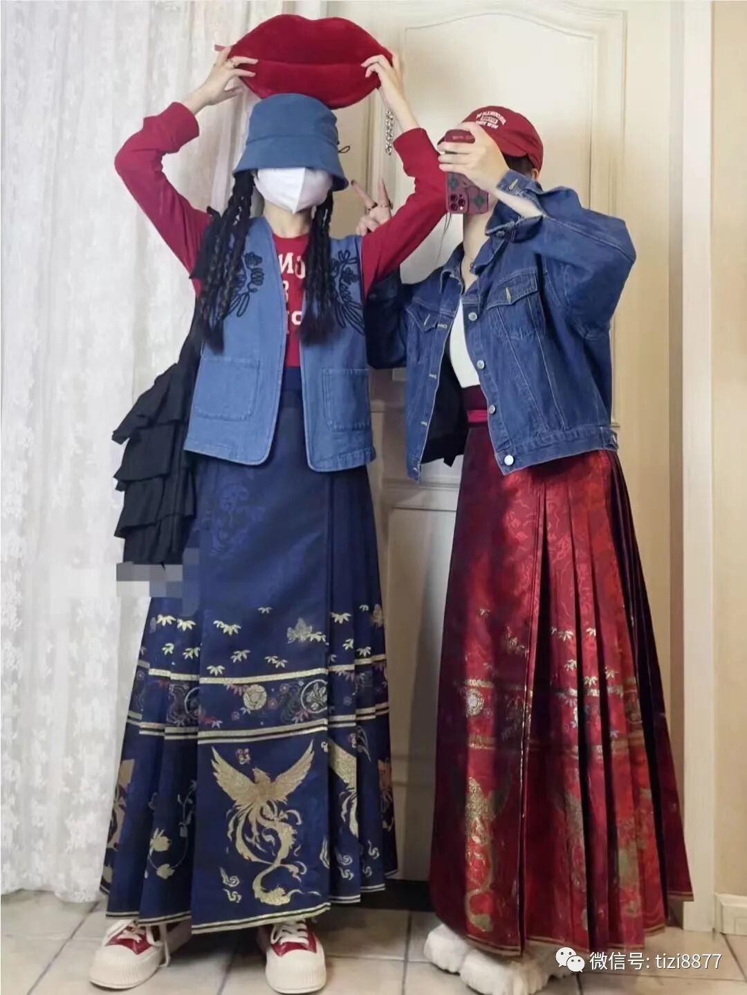用牛仔來(lái)搭配各色馬面裙其實(shí)非常實(shí)用,就好比你的牛仔褲可以跟大多數(shù)衣服都可搭,放心大膽嘗試;馬面裙比較輕,長(zhǎng)度也可以,搭配藍(lán)色牛仔馬甲放心沖。
