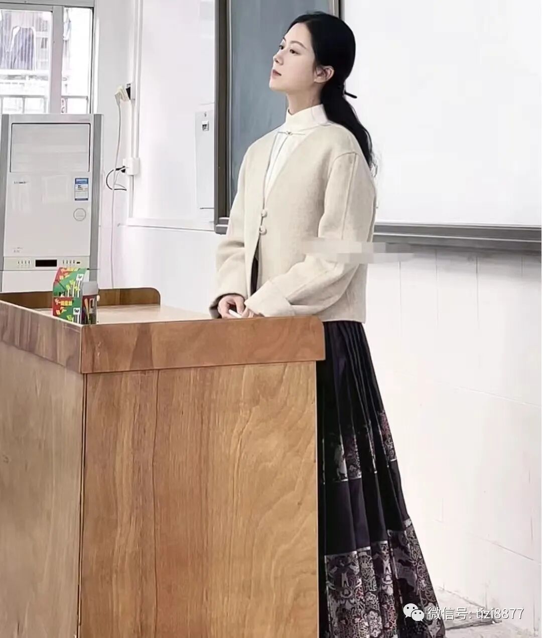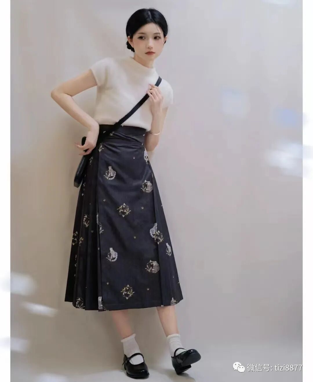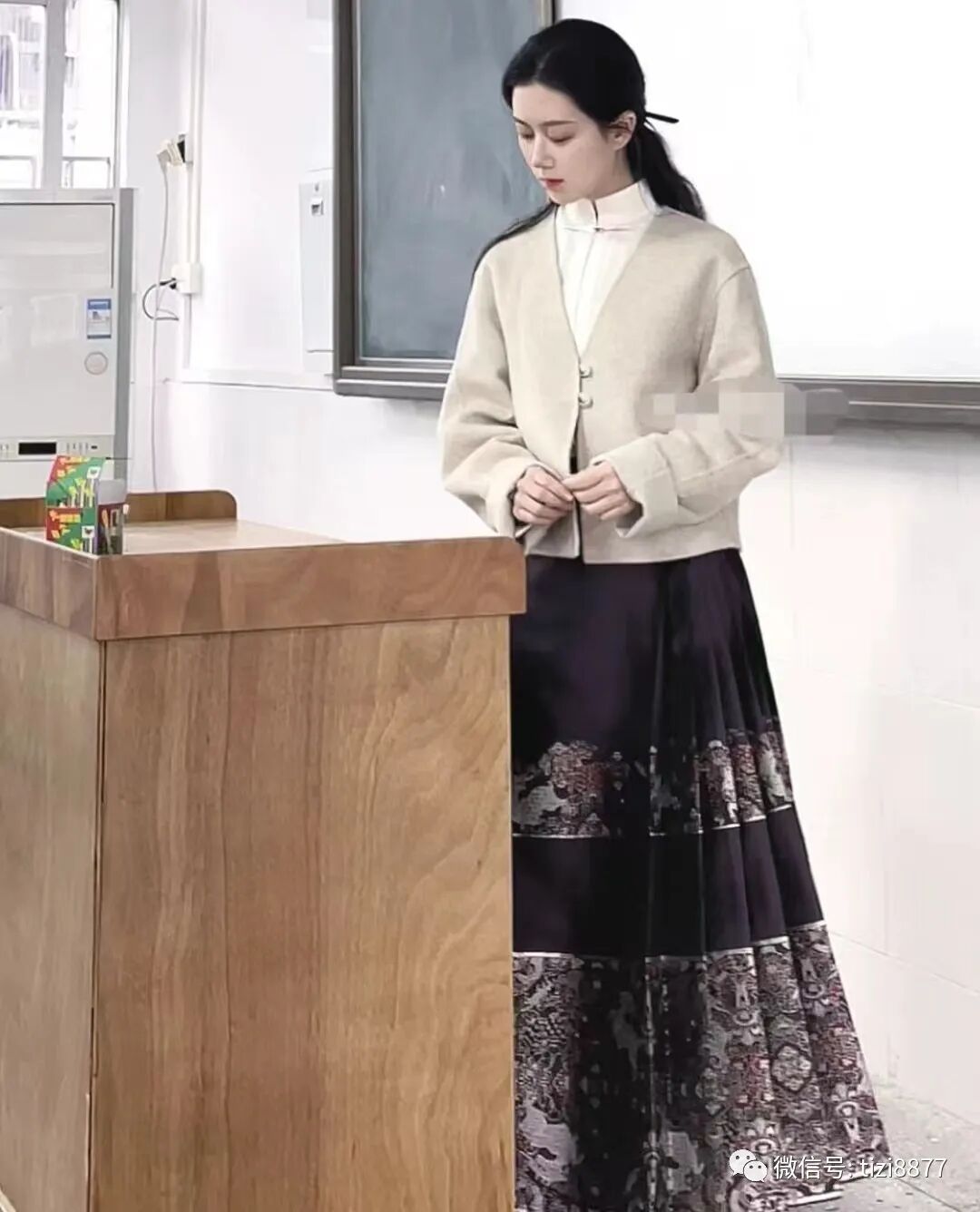 將馬面裙融入日常:搭配短款雙面呢外套拉長(zhǎng)比例,配立領(lǐng)/對(duì)襟/盤扣等元素有古典氣息,純色系上衣+包包可以讓整套look增添淡雅美。