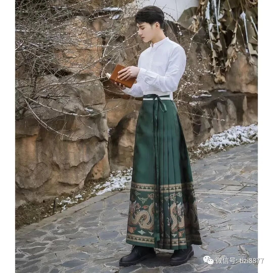 在古代,男人也是可以穿馬面裙的,國(guó)風(fēng)滿滿的馬面裙搭配百褶襯衫和黑色皮鞋,颯颯的拍照超出片。