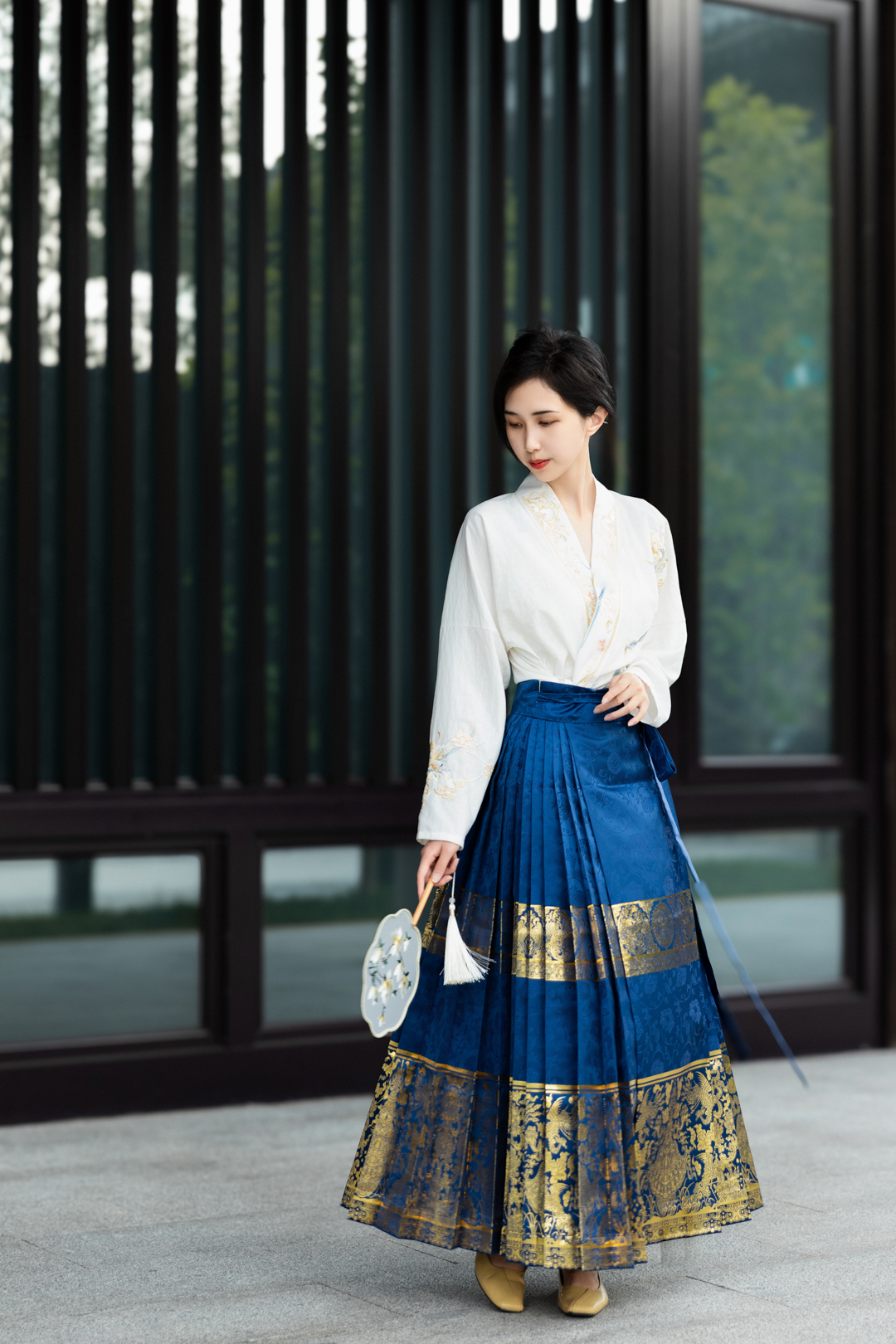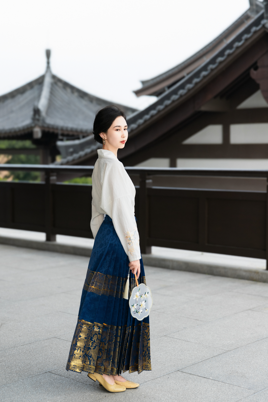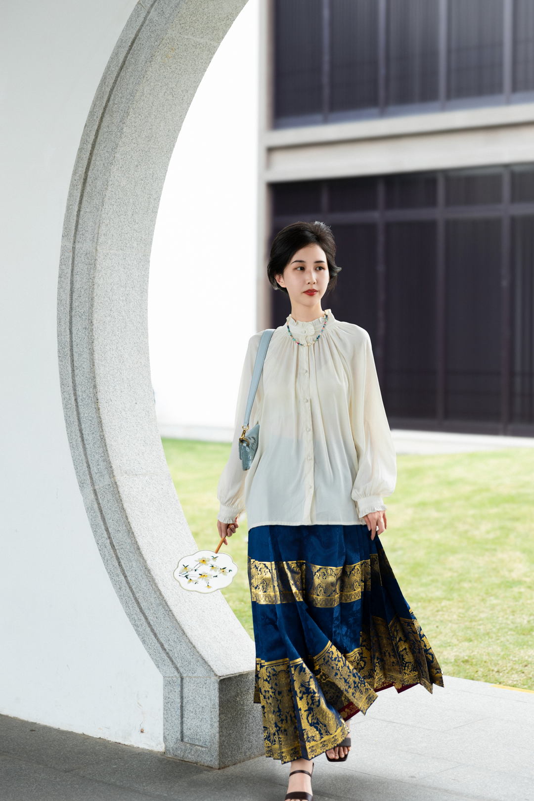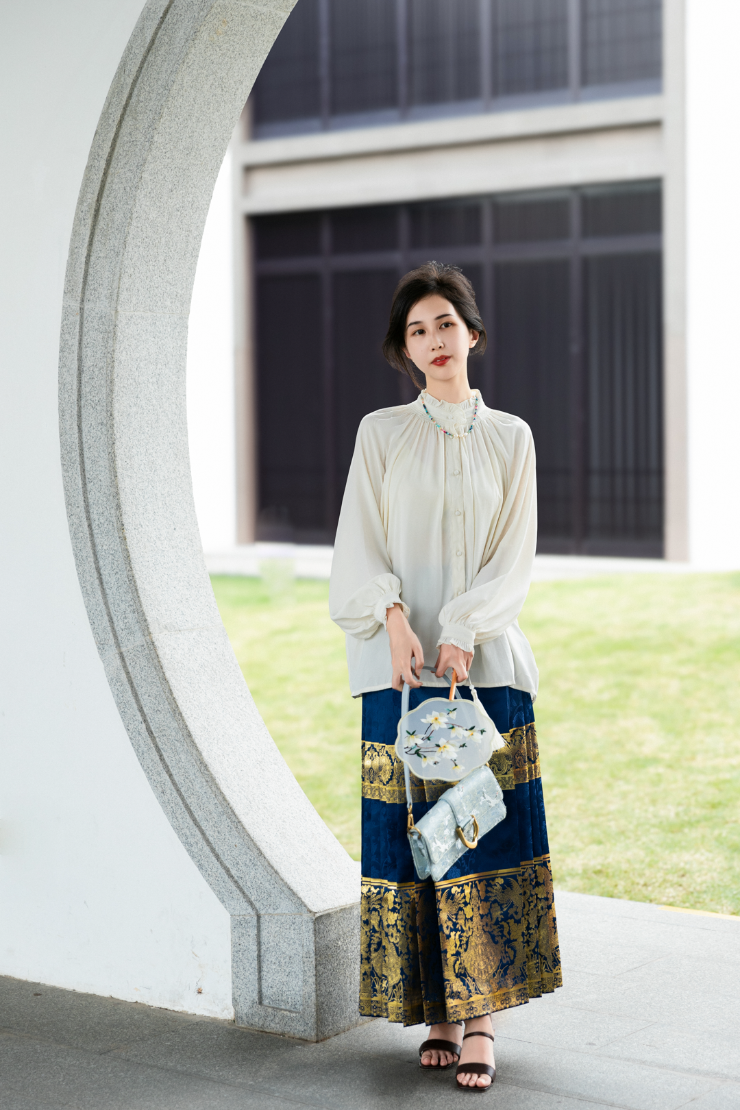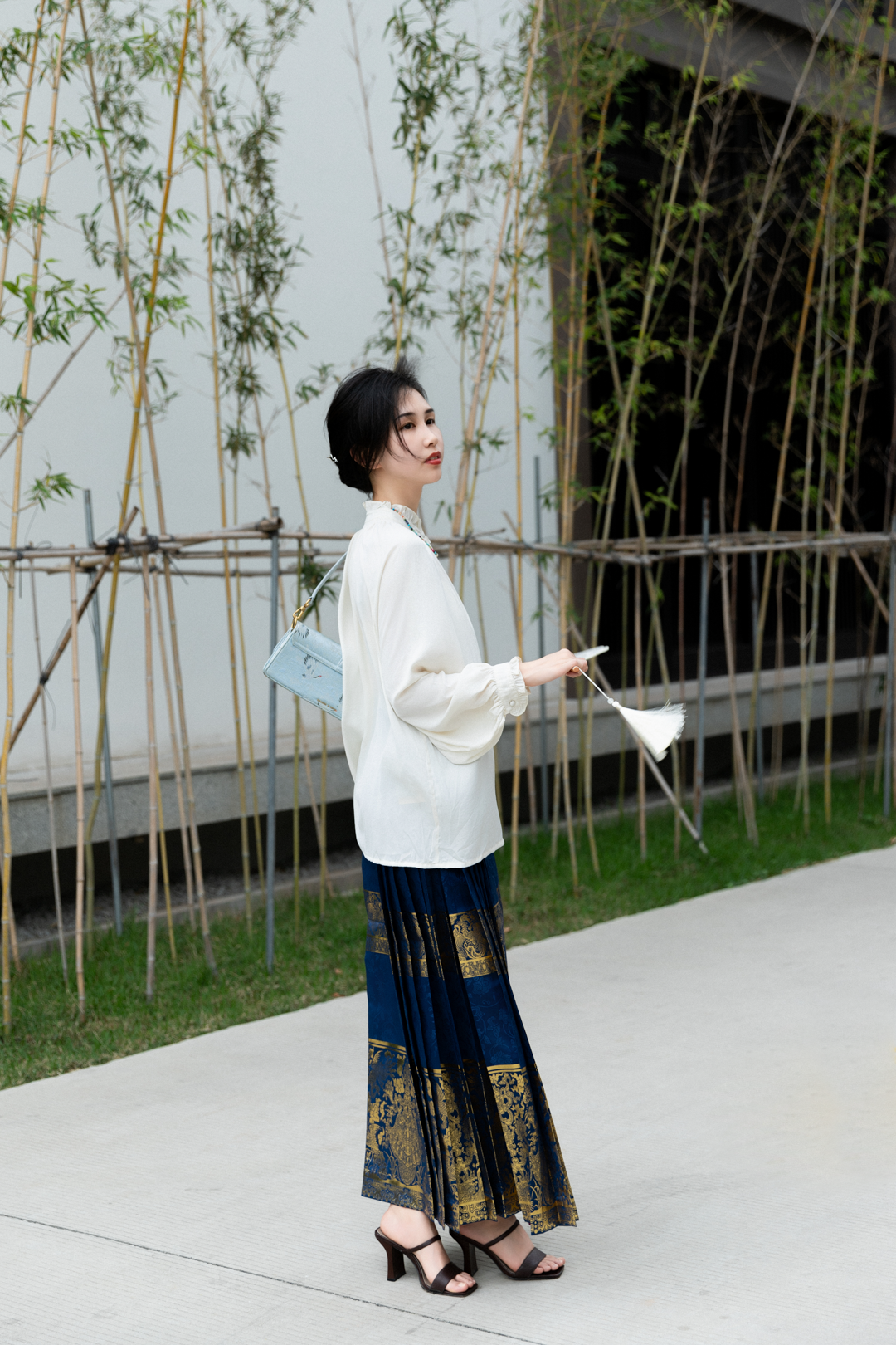 我對馬面裙的研究實在算不上深入,但如果只把它當作一條半身長裙來看,搭配就變得輕松許多,款式就盡管選自己覺得好看的。
