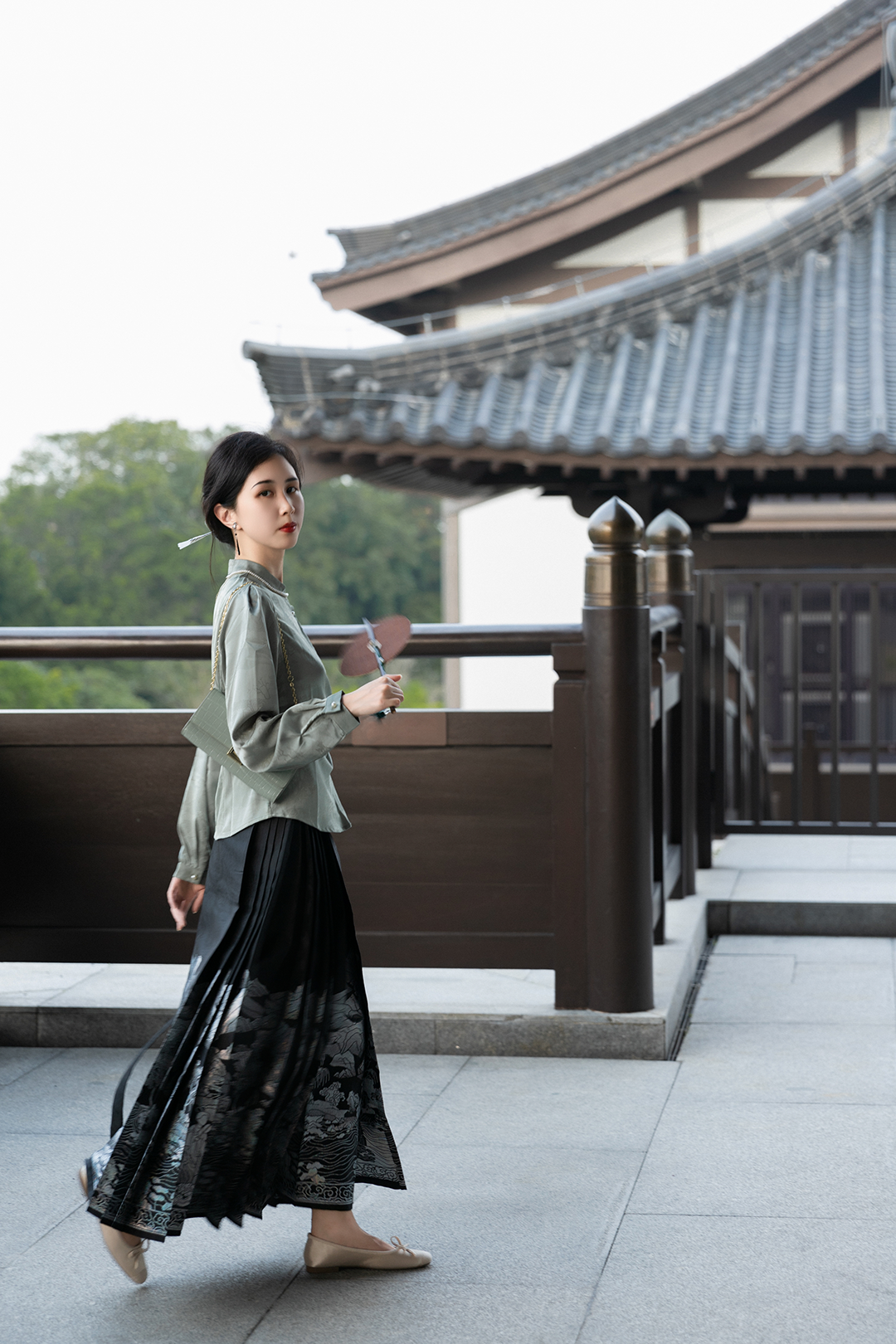 穿起馬面裙,盤個低發髻,現代女性穿新中式也照樣可以很干練。