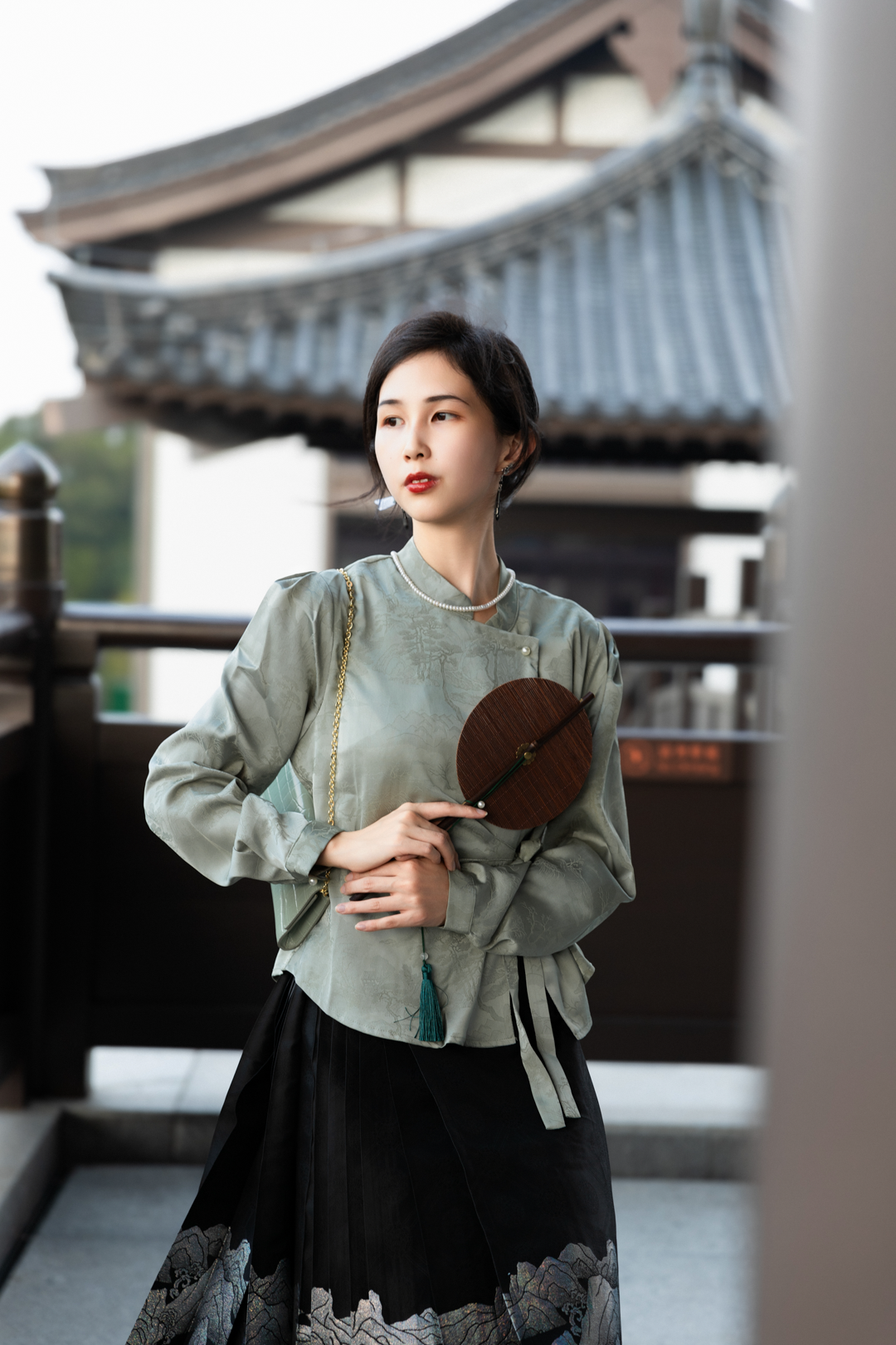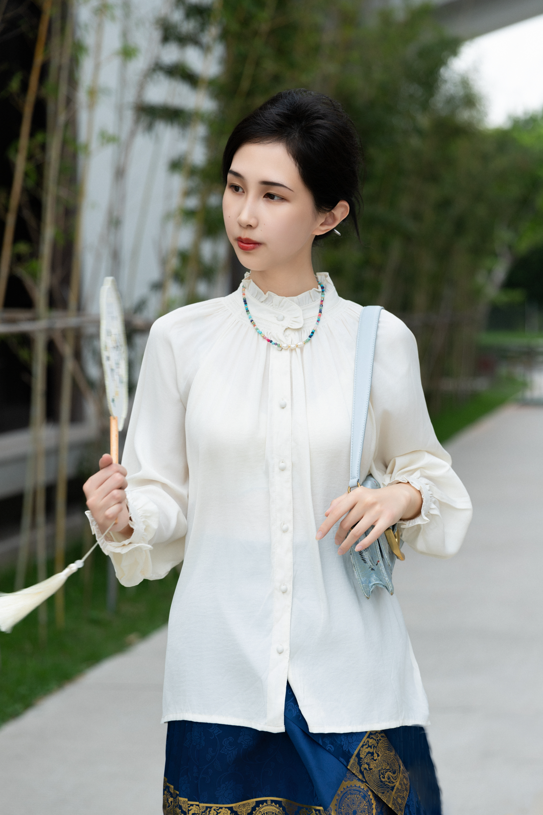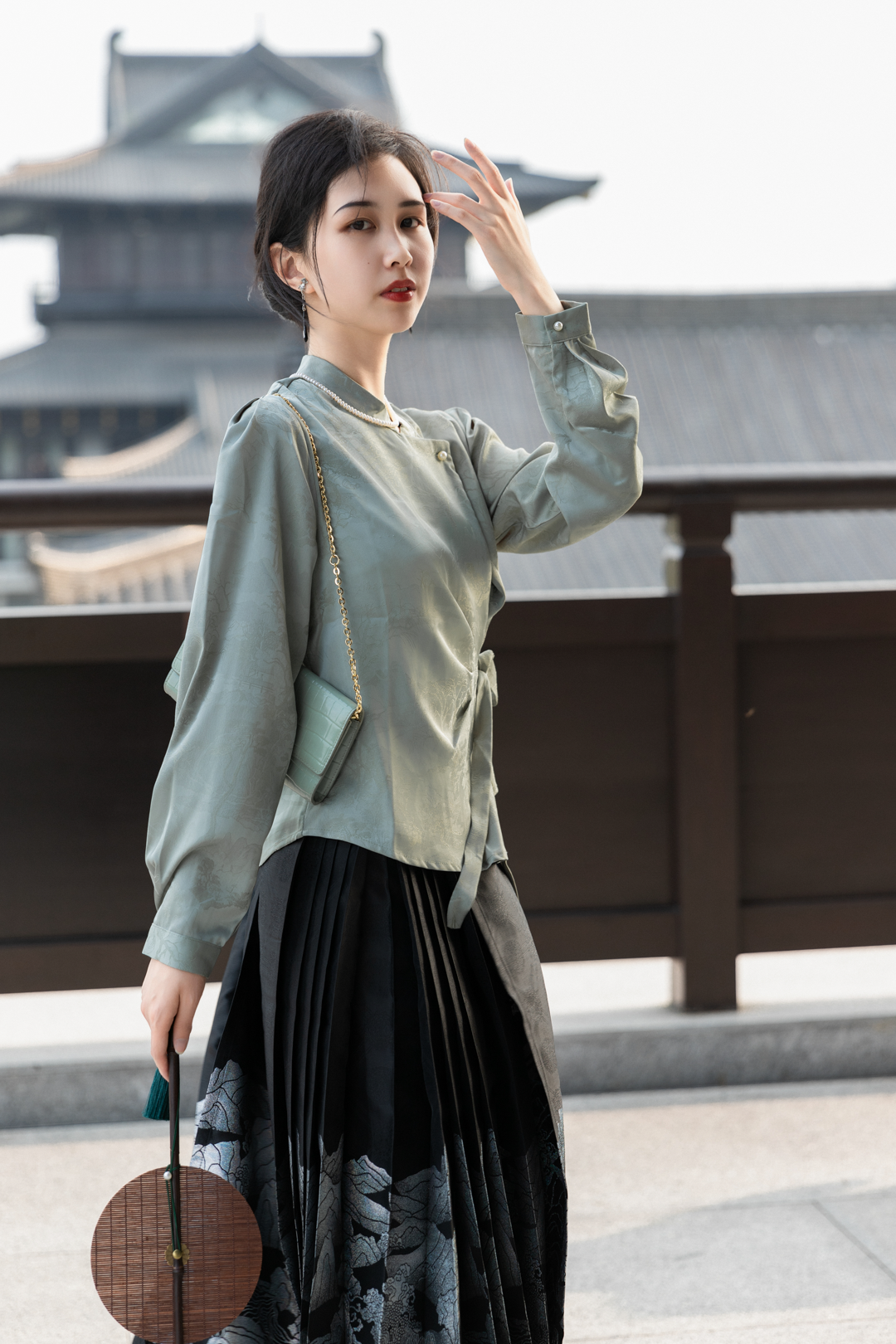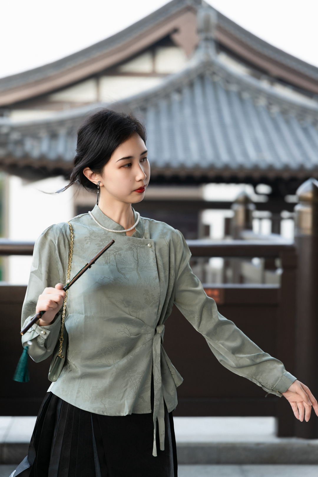 這件改良款的上衣,既有漢服形制的味道,帶了點絲綢緞面襯衫的感覺,領口還類似于民國的旗袍。