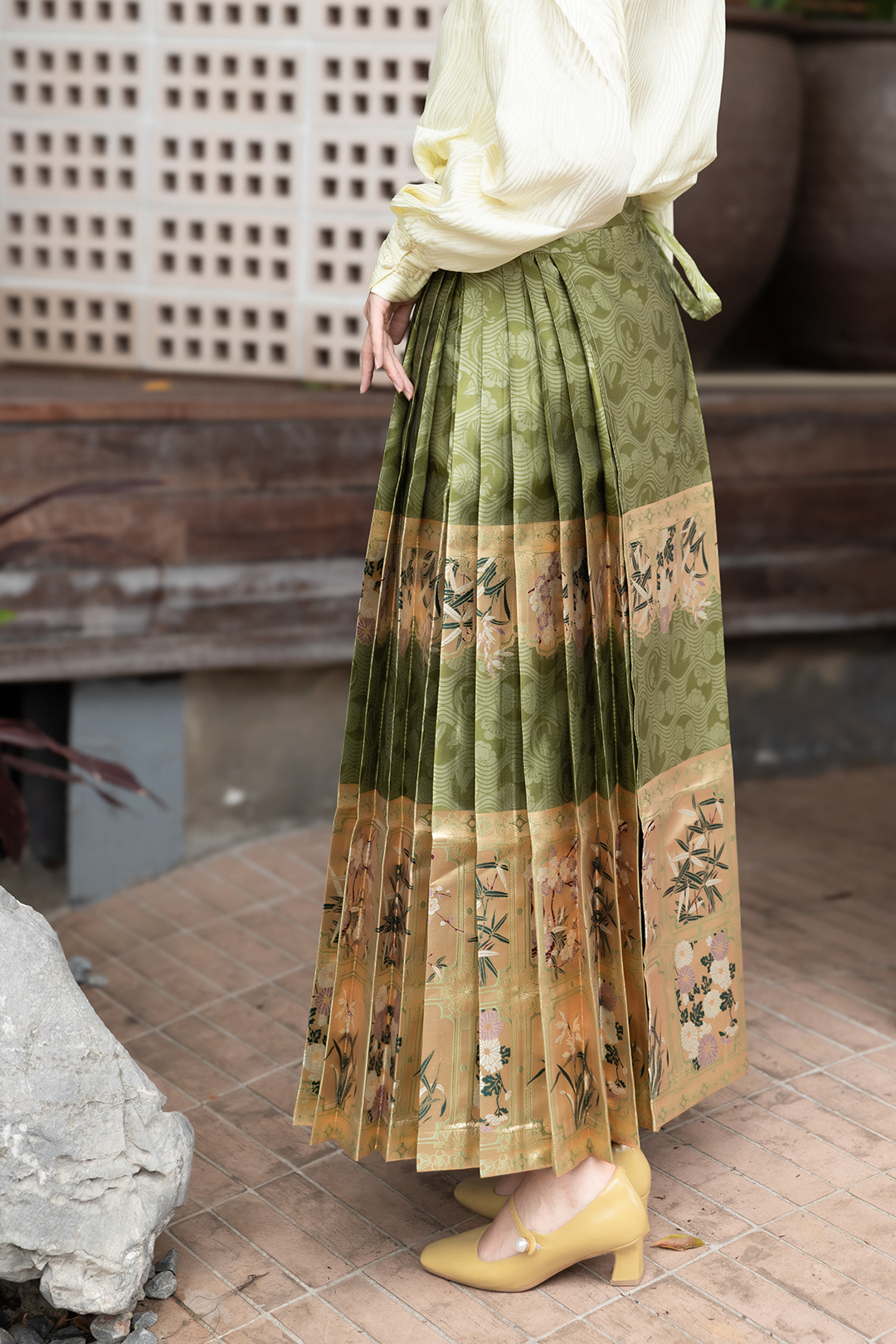 第一條亮相的馬面裙,是草綠拼接金黃的配色,上面有梅蘭竹菊的花紋樣式。