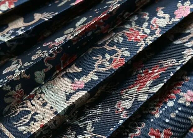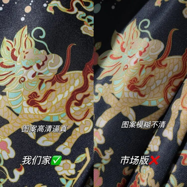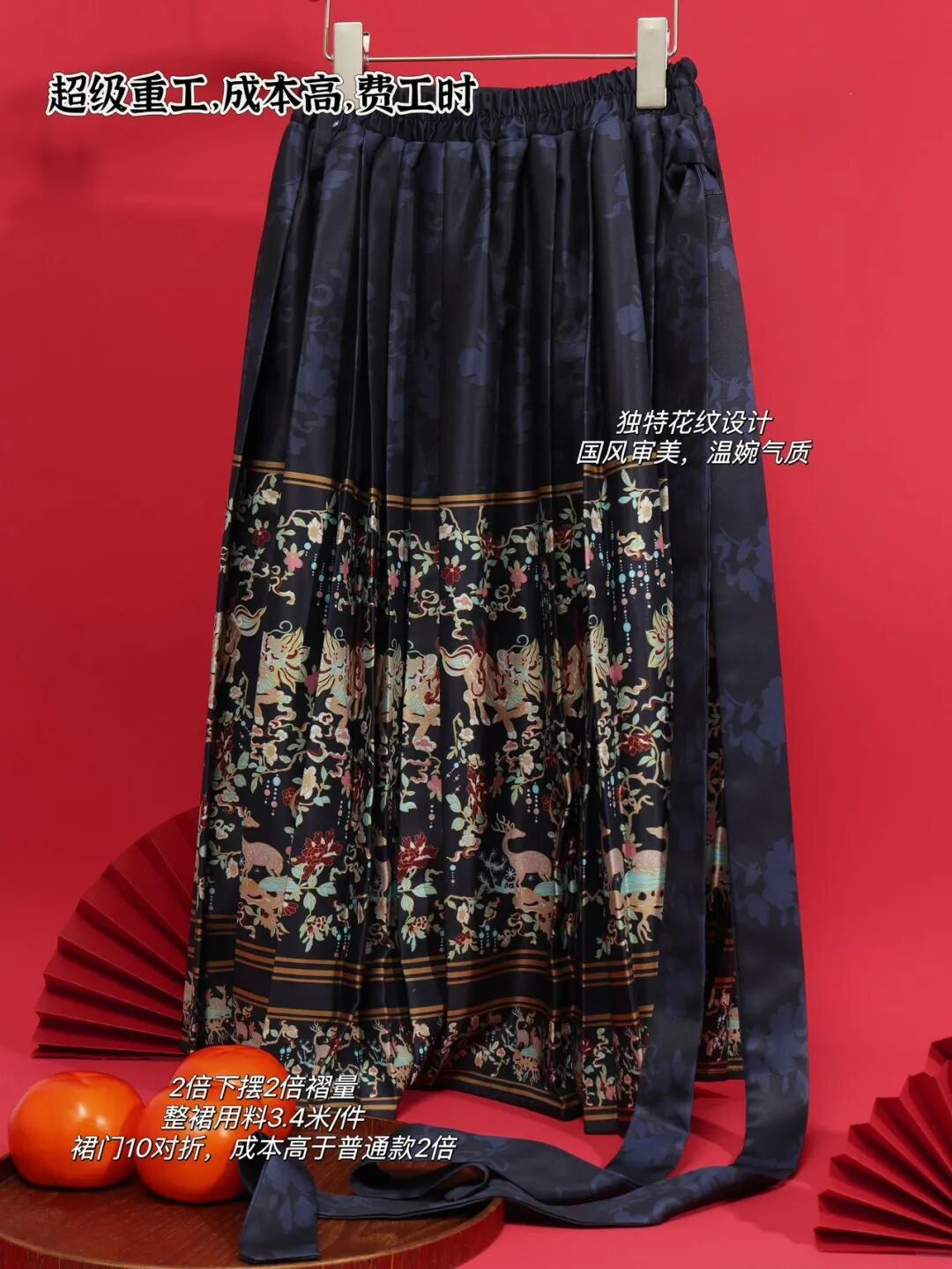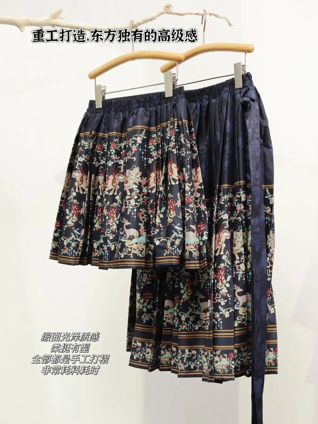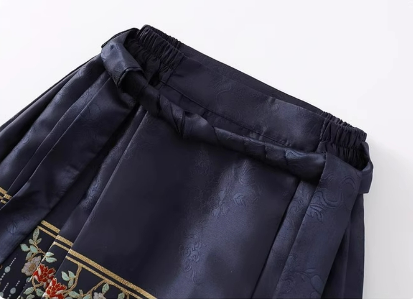 馬面裙,在制作工藝上也極其考究,面料采用的是一種類似綢緞的材質,緞面光澤質感,柔挺有型,你看到實物就會被驚艷到。