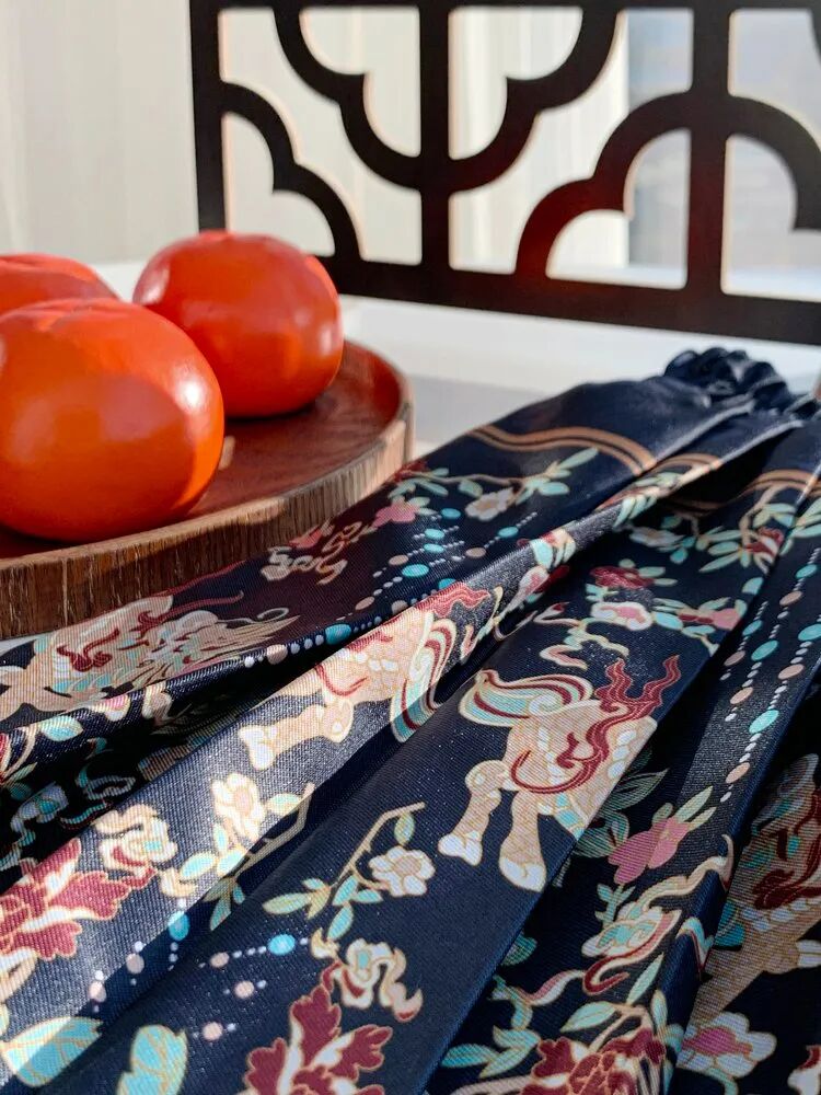 底色是藏青色,國風花紋的點綴,讓這條裙子又美又颯又華麗。