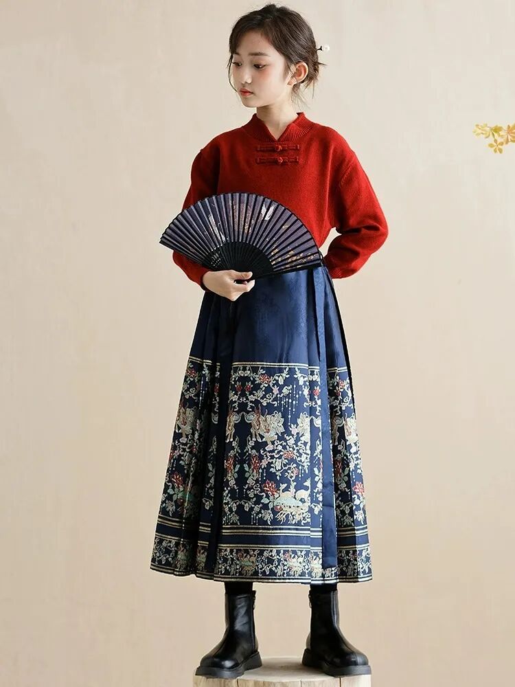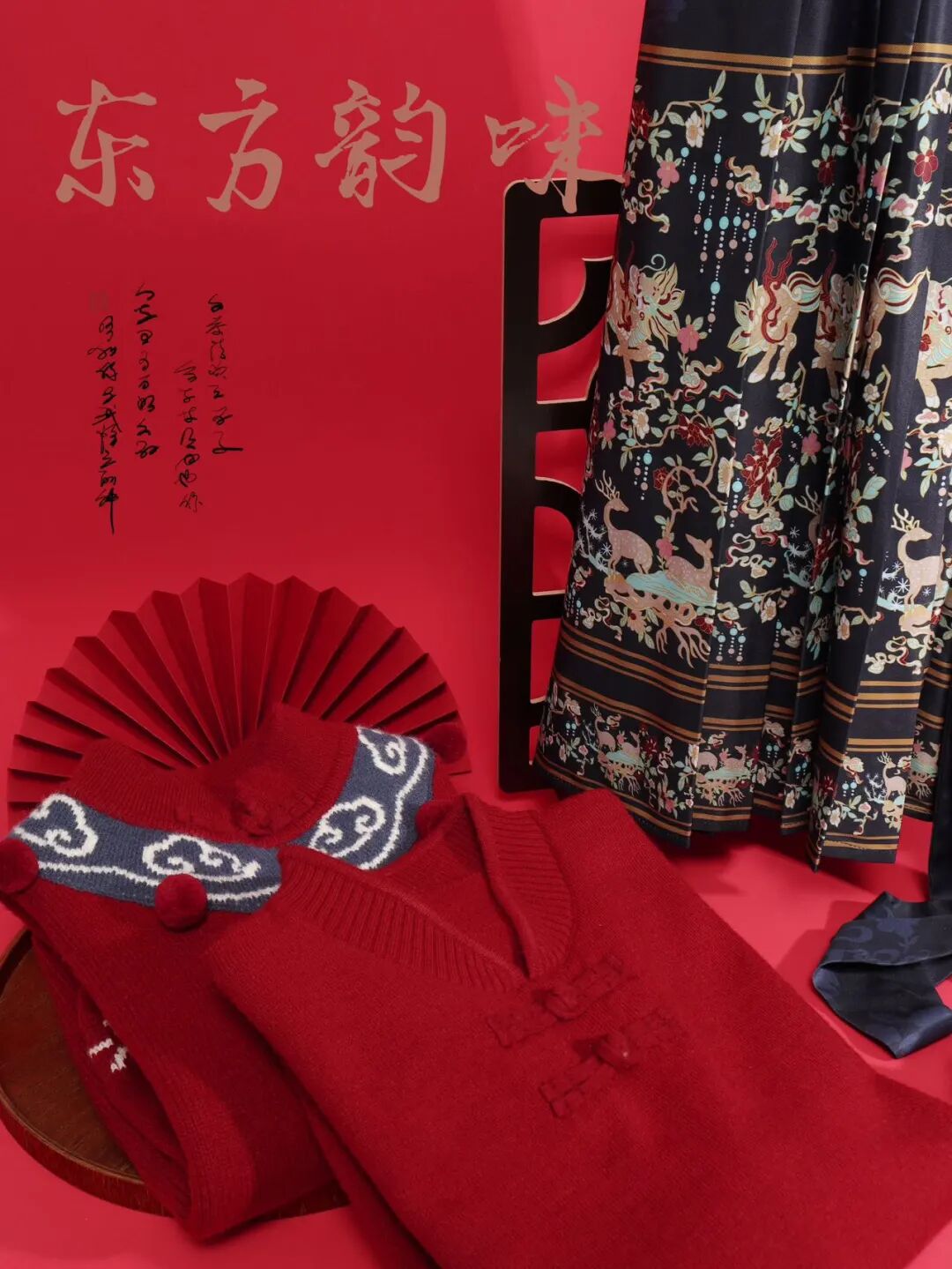 產品款式:長款馬面裙、短款馬面裙 、撞色祥云毛衣、盤扣毛衣