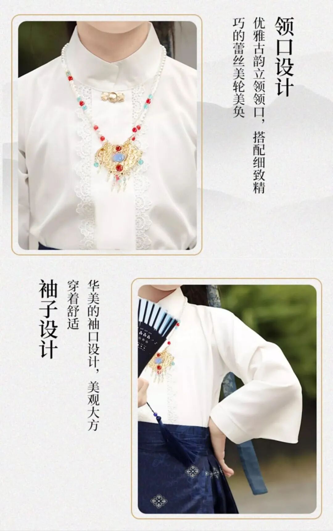 優(yōu)雅古韻的立領上衣,搭配細致精巧的蕾絲,極具古韻,讓整套裙子看起來更加精致。