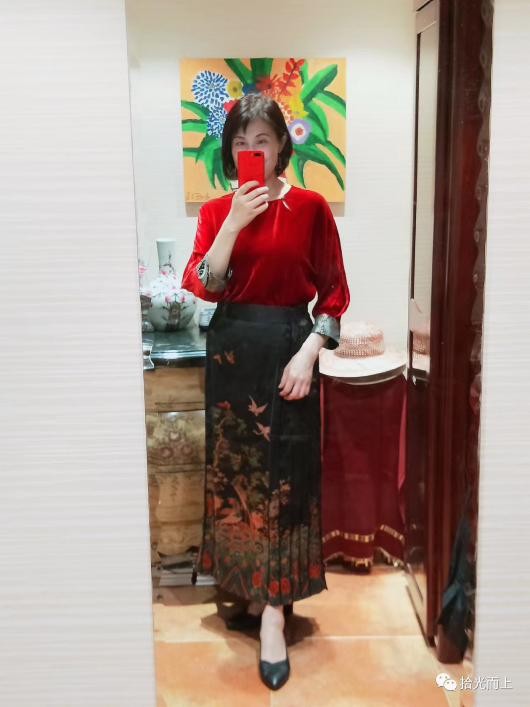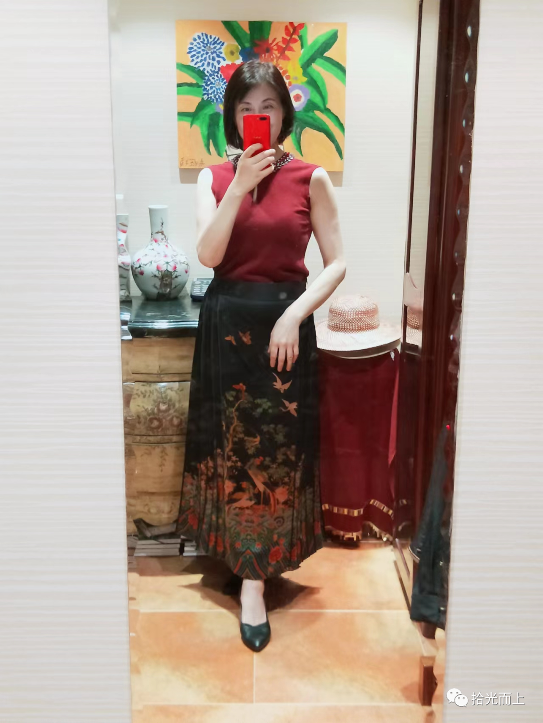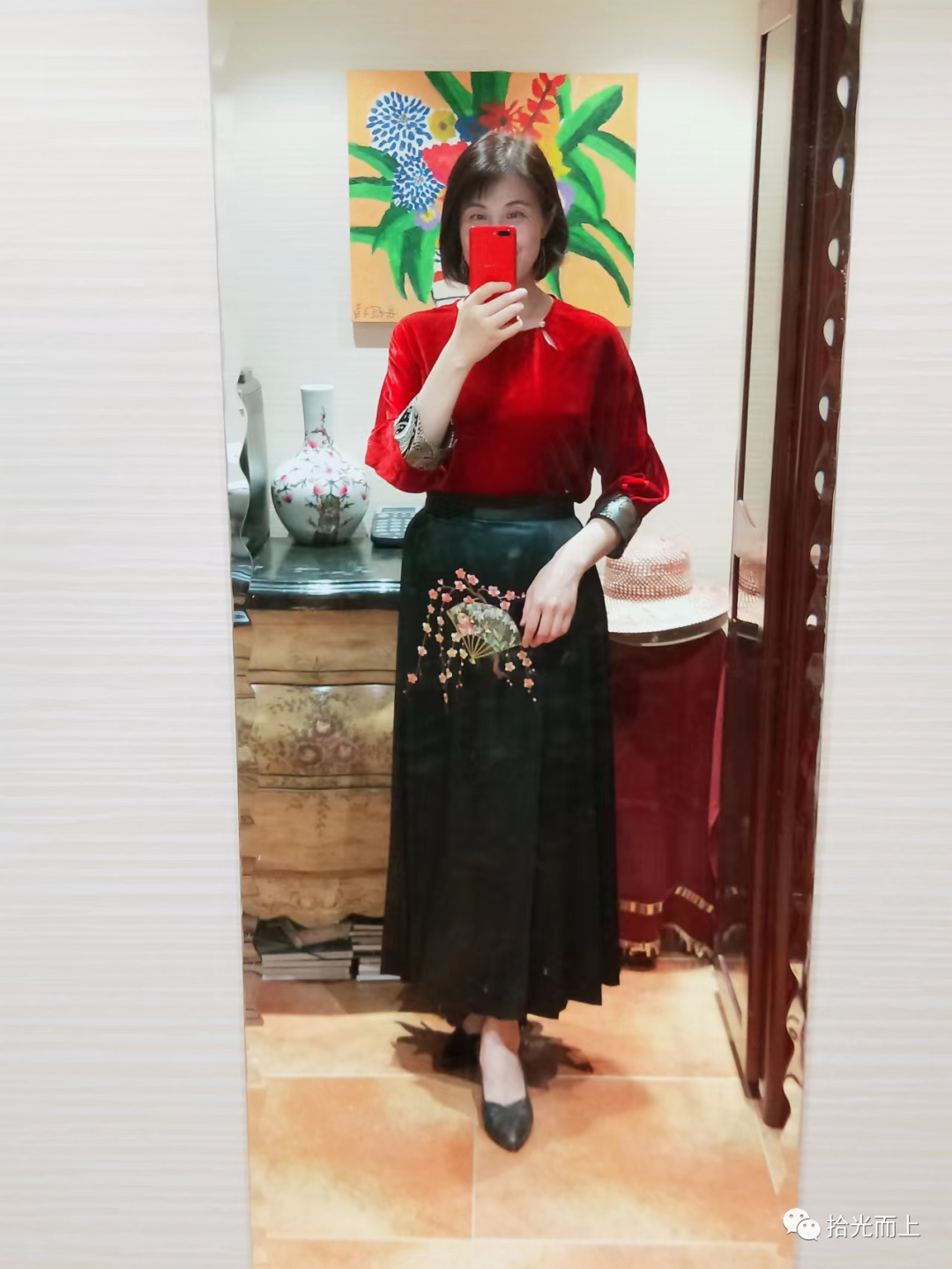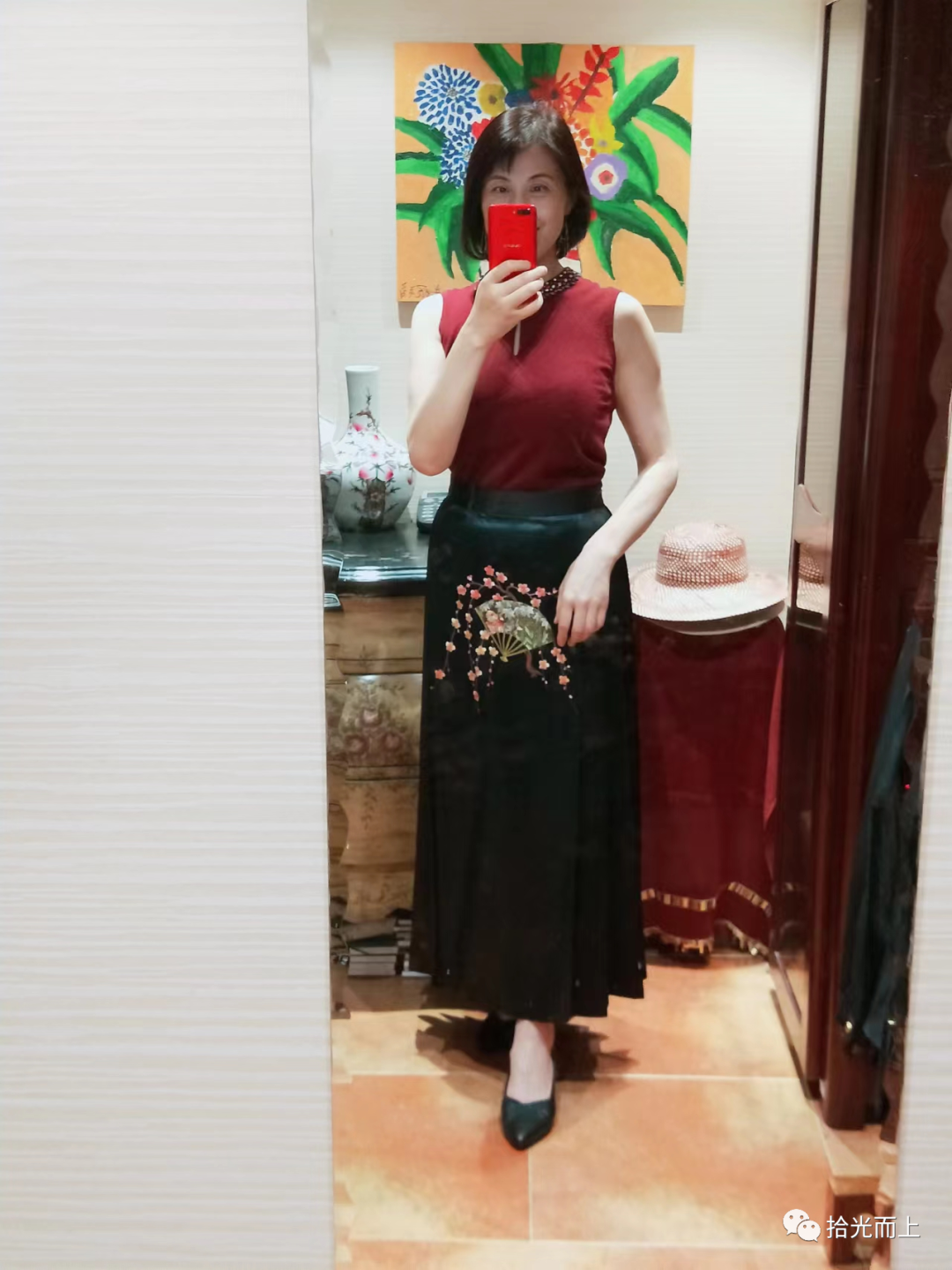 下面是兩條今年比較火的中式馬面裙的搭配。一條黑色刺繡,一條黑色印花。