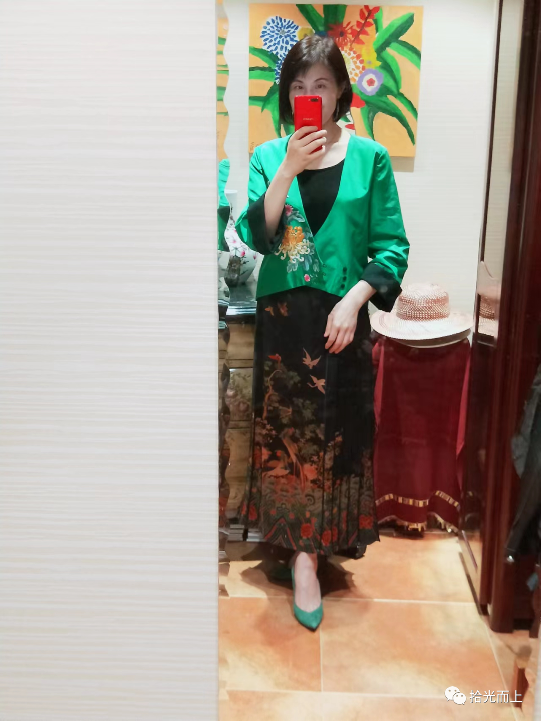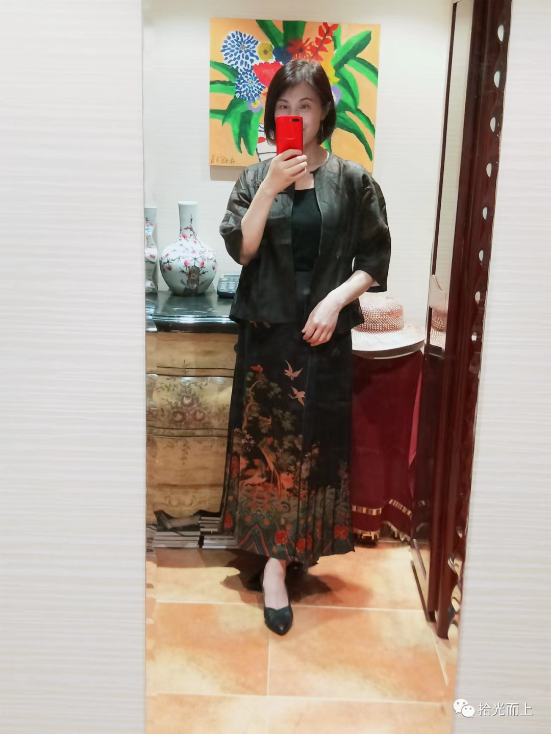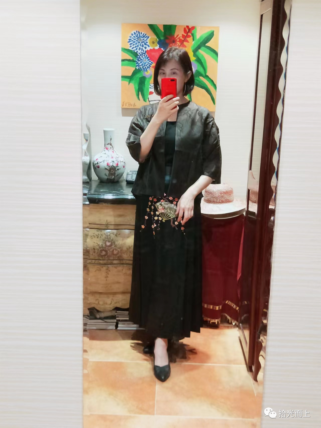 黑色刺繡那一條是請一個湖南老鄉設計師朋友設計后制作的,面料有兩個來源,刺繡部分來源于北京西四都通真絲店的老蘇繡睡衣的后背部分,其他面料是厚重的醋酸料。黑色印花那一條直接在西四都通真絲店買的成衣,面料是重磅香云紗。