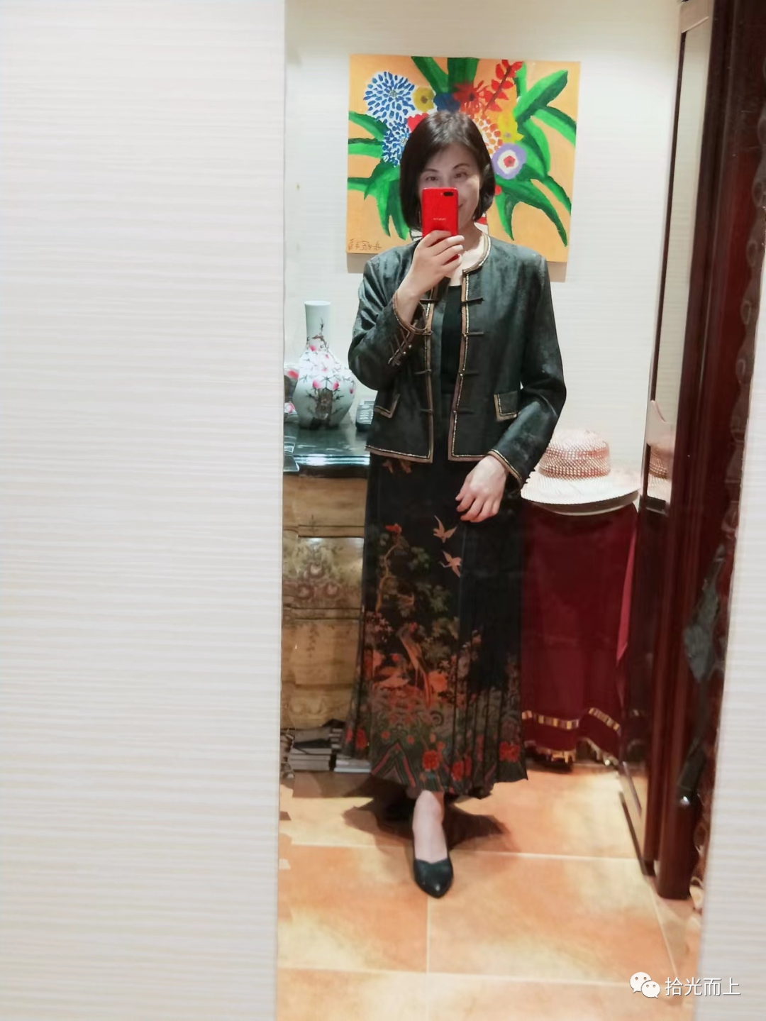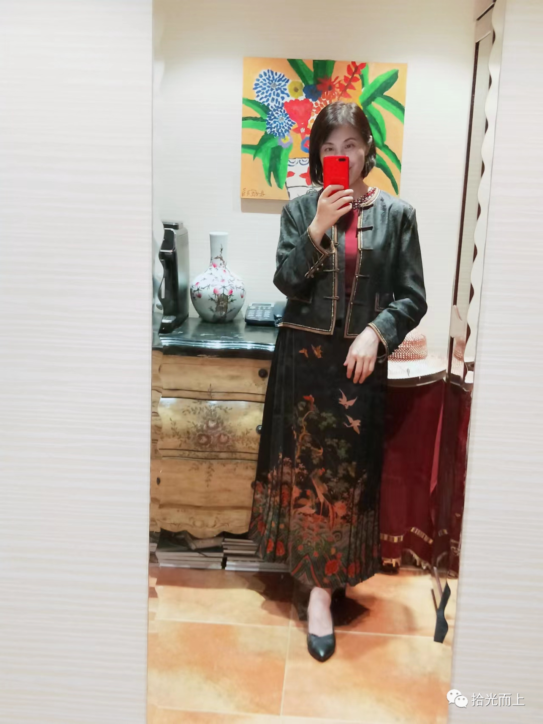 下面是另一條馬面裙的搭配。該裙的印花很有特點,是傳統的吉祥如意的圖案,我想穿著這樣的衣服在故宮一帶的紅墻下拍照應該很應景吧。