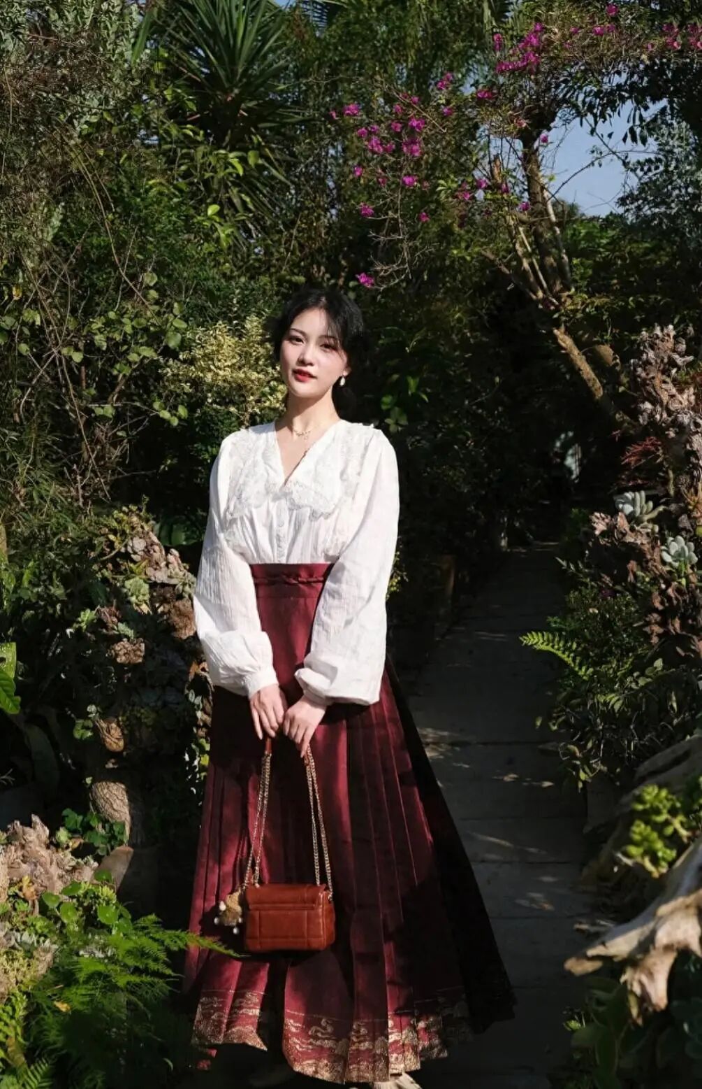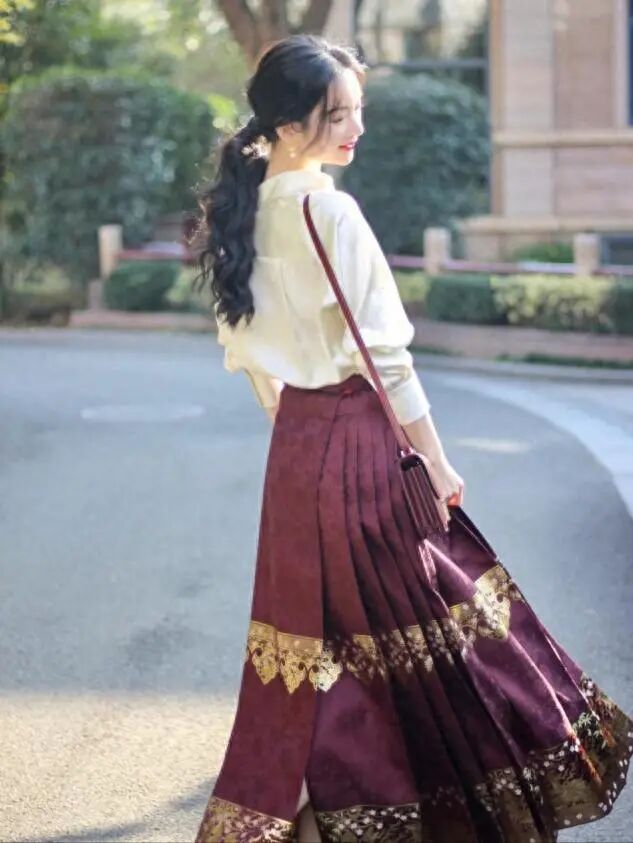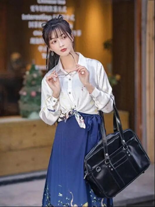 可以選擇一款質感細膩的絲質或者雪紡襯衫,與馬面裙相得益彰。