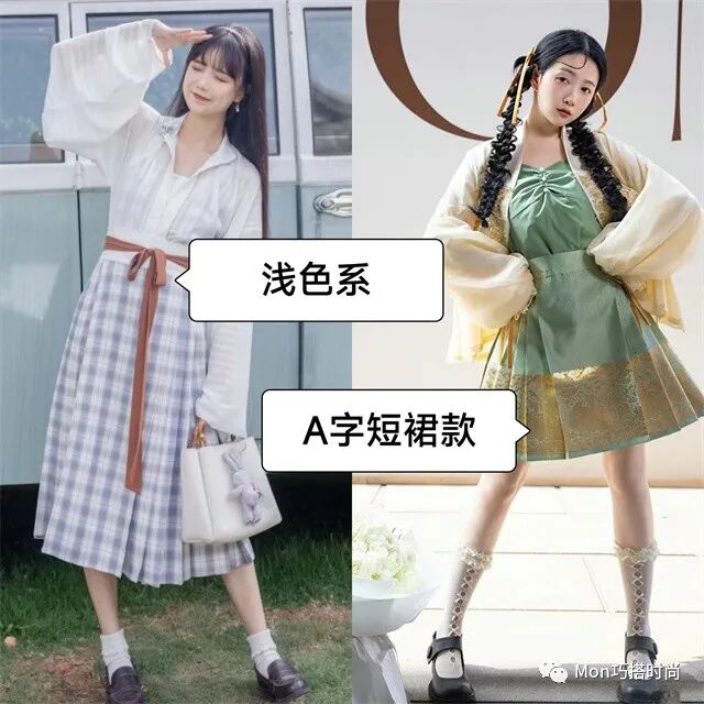 小個子女生可以多選擇淺色系馬面裙,更有少女感。也可以選擇改良后的a字短款,搭配厚底瑪麗珍鞋+中筒襪,分分鐘美麗值爆表!