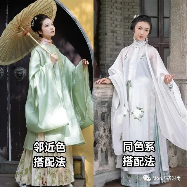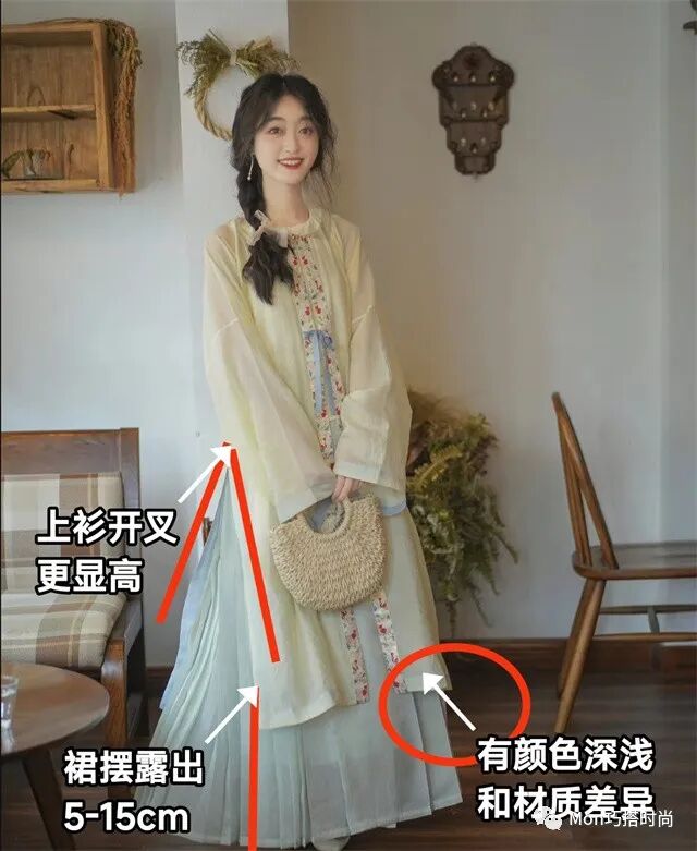 上衫和馬面裙間也要有差距。可以是顏色的深淺差異,也可以是材質的厚薄、光澤感差異。如果怕顯矮,在長衫側邊開叉,也能穿出窈窕身姿喲~