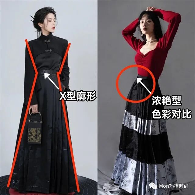 大骨架和微胖女生推薦使用腰線明顯的x型廓型;小骨架姐妹選擇上緊下寬更顯優勢;還可以使用紅黑撞色、紅藍配色等濃艷型色彩對比穿出新中式的華麗感。