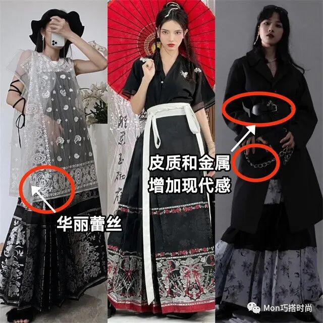 因此,在新中式穿法中,黑色馬面裙最為常見。不管是搭配重工感極強的華麗蕾絲,還是結合皮質和金屬元素增加現代感,都是不錯的穿法哦~