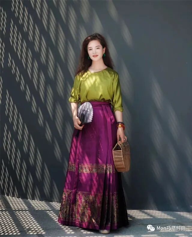 古典馬面裙多用過膝長衫去疊穿。一般來說,露出5-15cm的馬面裙擺最能展現馬面的美,又能穿出層次感。