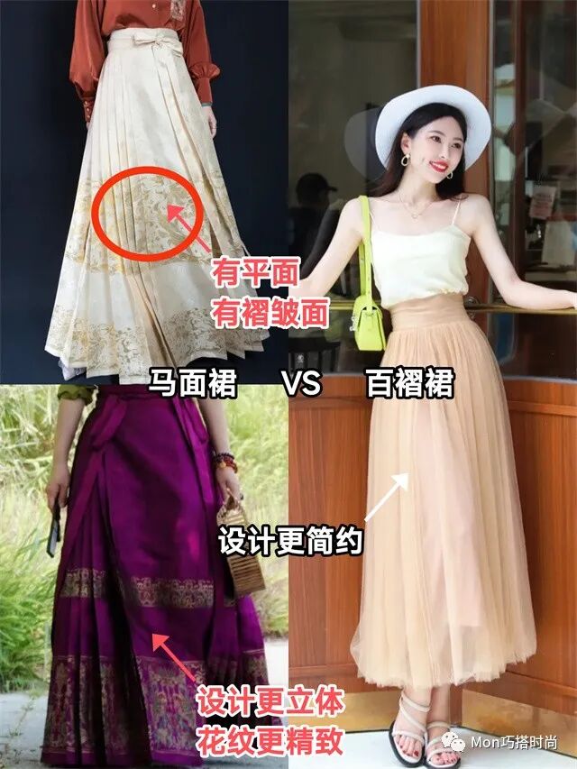 馬面裙有平面也有褶皺面,更立體,又有精細的花紋。而百褶裙設計更加簡約現代。這下分清這對孿生姐妹了嗎?