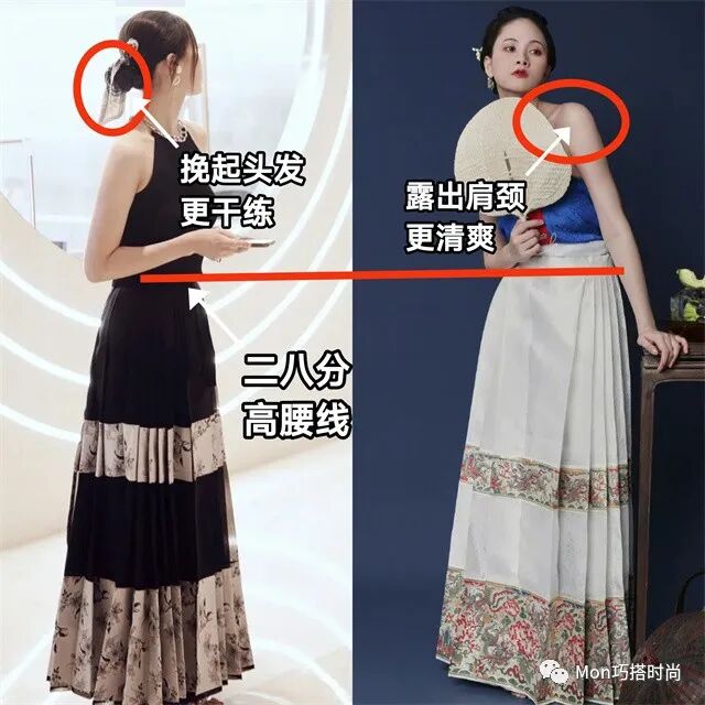黑色馬面裙可以搭配露肩掛脖吊帶,挽起頭發更加干練。白色馬面裙選用二八分高腰線,露出肩頸更為清爽。