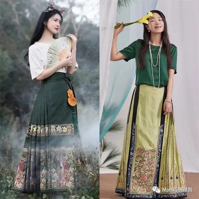 為了避免過于老氣,可以配更休閑的基礎款T恤。左邊的白色T恤配馬面裙,右邊的深綠色T恤配鮮綠色馬面,都是能輕松走進日常的搭配。