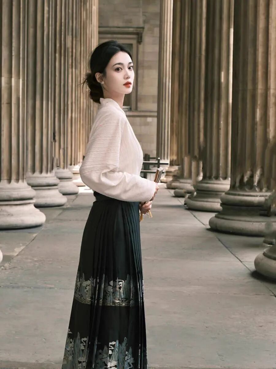 這套馬面裙搭配白色襯衫,看似是簡單搭配,實際上是歷史與現代的碰撞與交融。