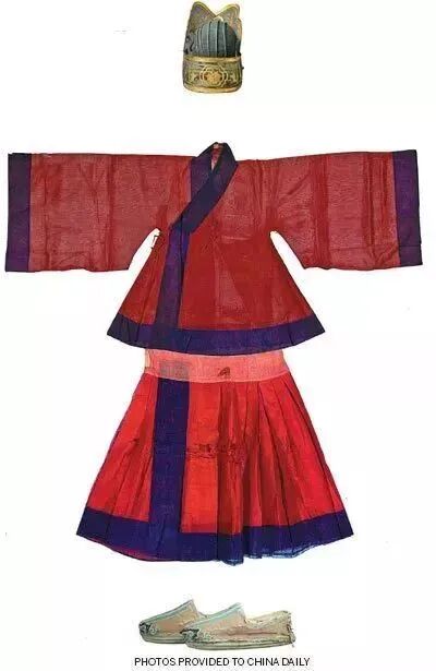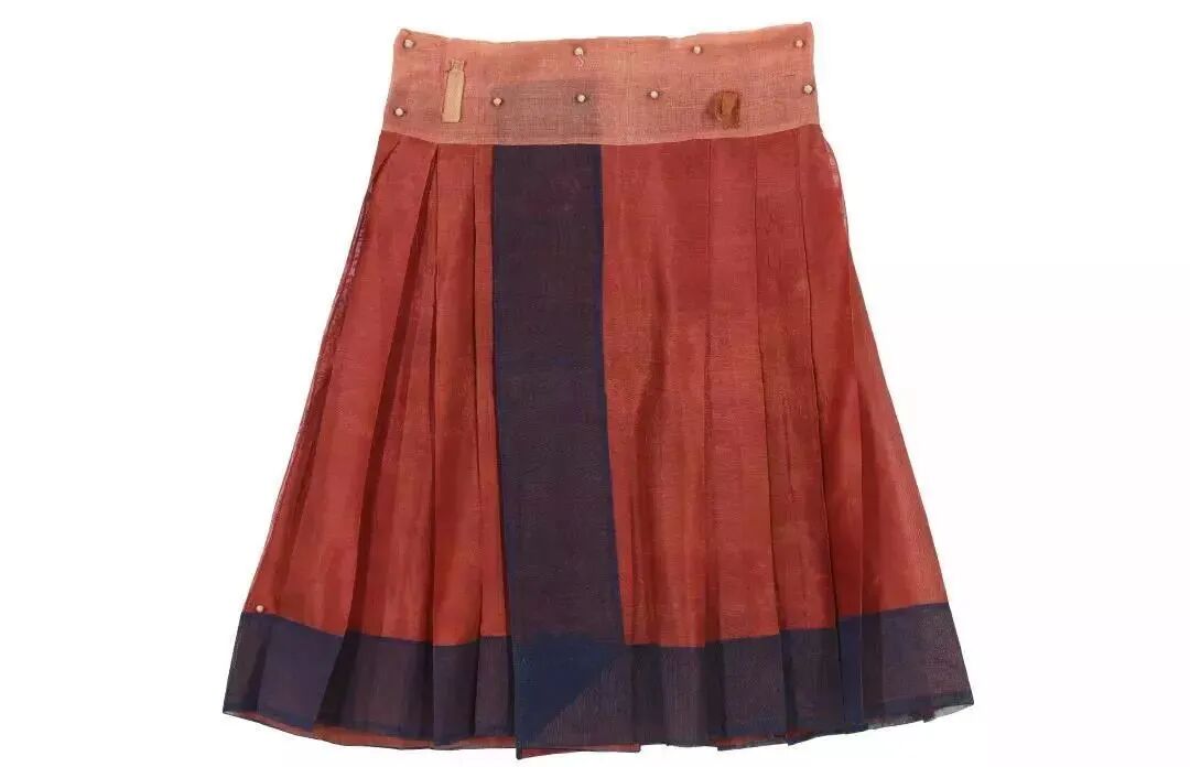 男款馬面褶旋裙結構的下裳。赤羅裳,身長89厘米,腰圍129厘米。赤羅裳身,桔黃色圍腰,青羅鑲邊