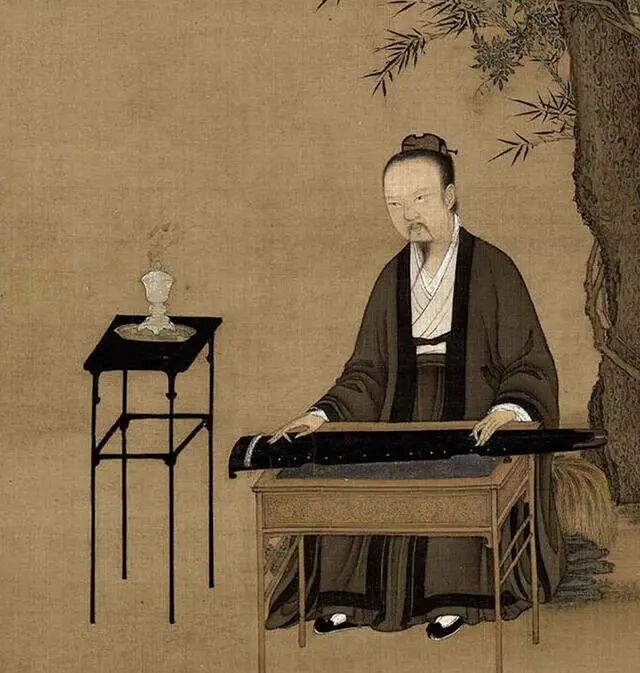 傳為北宋宋徽宗趙佶創作的《聽琴圖》,撫琴者穿衣裳大氅/氅衣