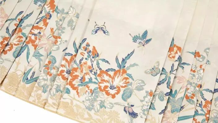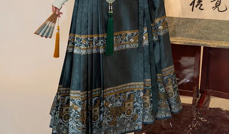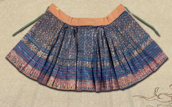 馬面裙,又名馬面褶裙,是一種常見明制下裙。馬面裙前后有四個裙門,兩兩重合,側(cè)面打裥,中間裙門重合而成的光面,俗稱馬面。