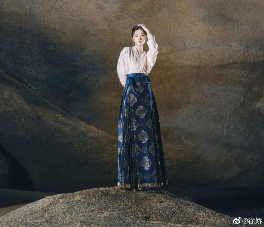 徐嬌整體造型選擇白色繡花上衣?藍(lán)色暗金刺繡馬面裙,白色雖然色著簡單,卻在紋樣上凸顯小心思,上衣紋有祥云暗紋,增加質(zhì)感,一點不差其他女星禮服的華貴,又突顯東方獨有的內(nèi)涵。