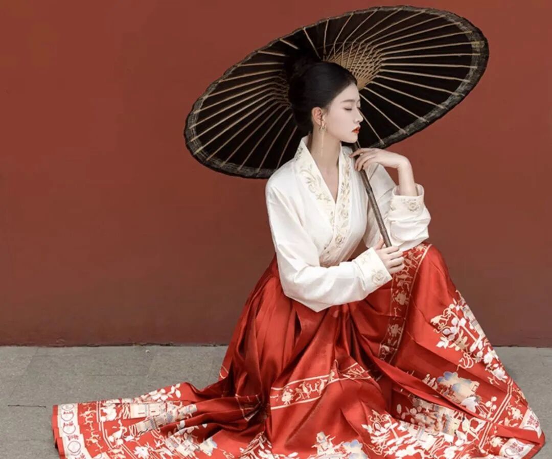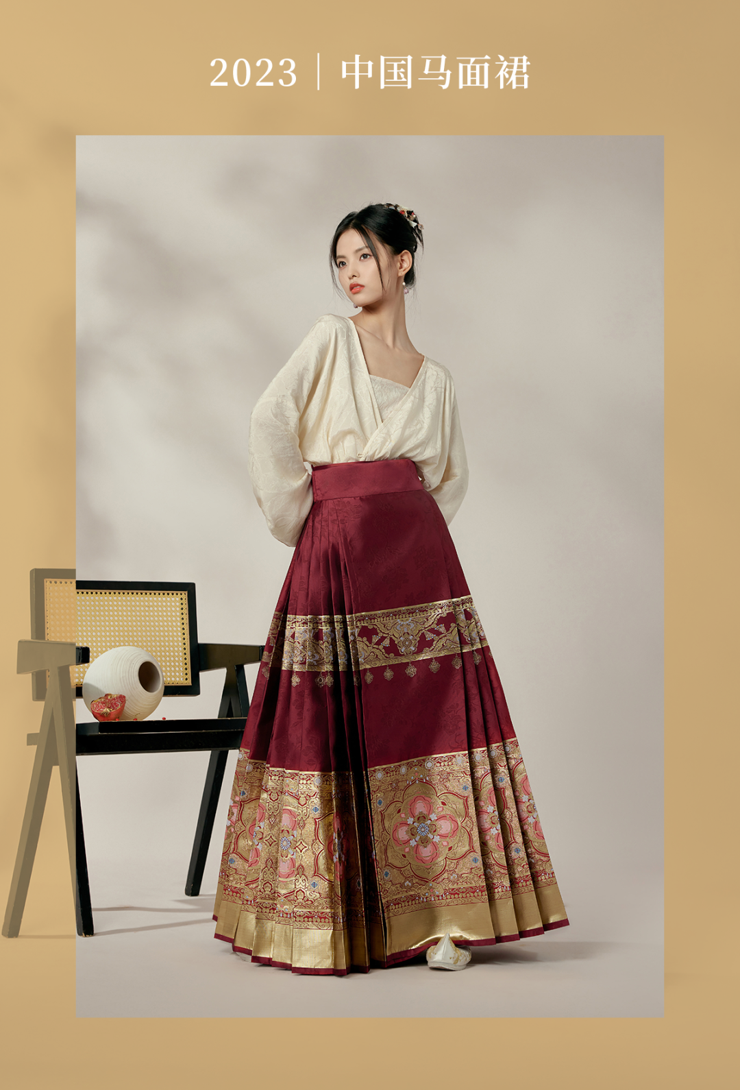 繁簡相襯的穿衣方式,在一種視覺上形成極大反差,純色經(jīng)典款的純色基本不會出錯,給我們選取馬面裙提供多樣性選擇,燙金鏤空,又或者是刺繡的工藝都可以大膽使用,調(diào)節(jié)視覺上的舒適度。