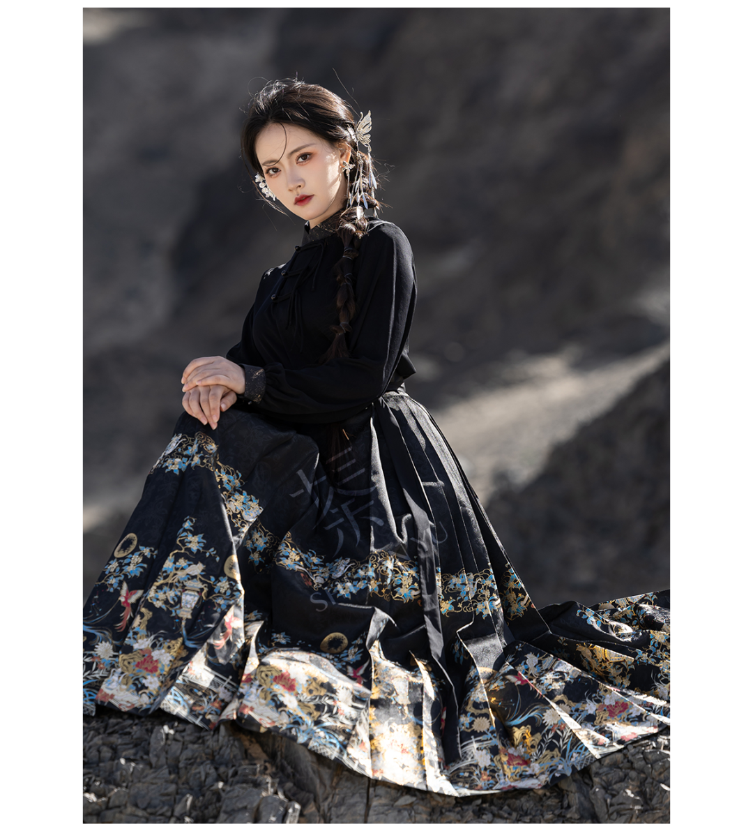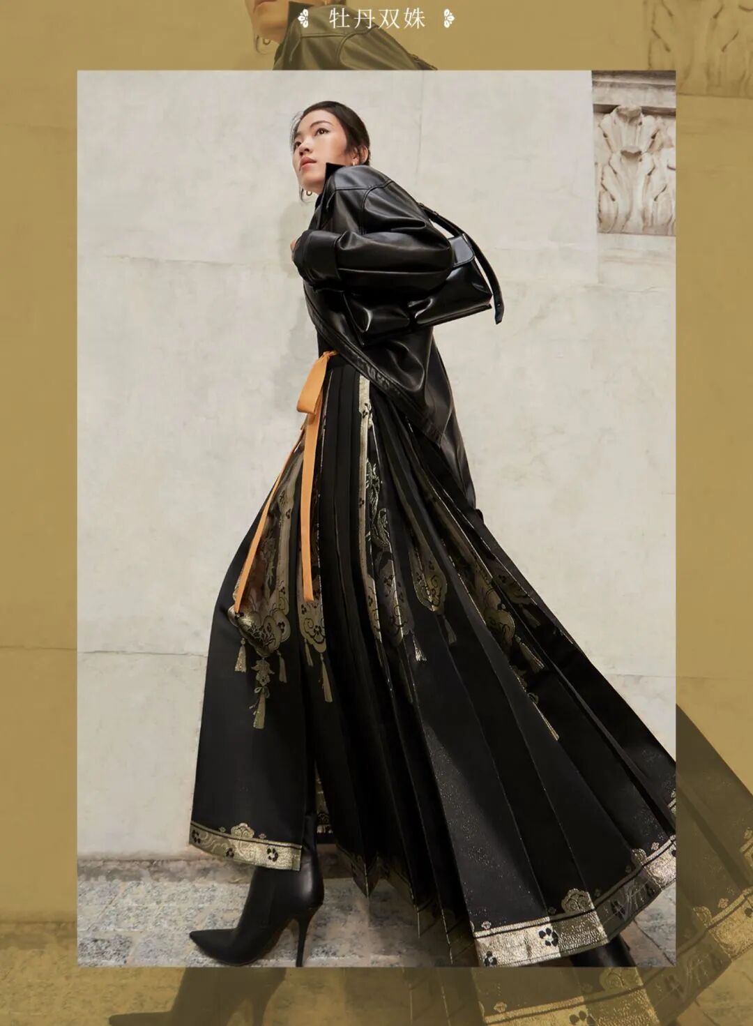 黑色襯衫搭配的是一件同色系織金馬面,是不會出錯的一套穿搭,黑色的裙身搭配金色的織金圖案,給整套服飾增加質(zhì)感,馬面裙上的暗紋裝飾更是增加大氣沉穩(wěn)的氣場。