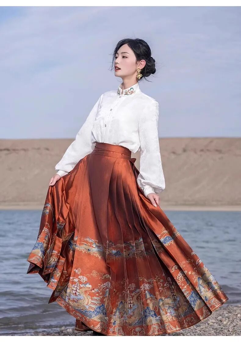 從正面看過去有一個光面(不打褶)而兩側(cè)打褶的裙子。不打褶的光面就被稱作馬面,馬面裙也是由此得名的。