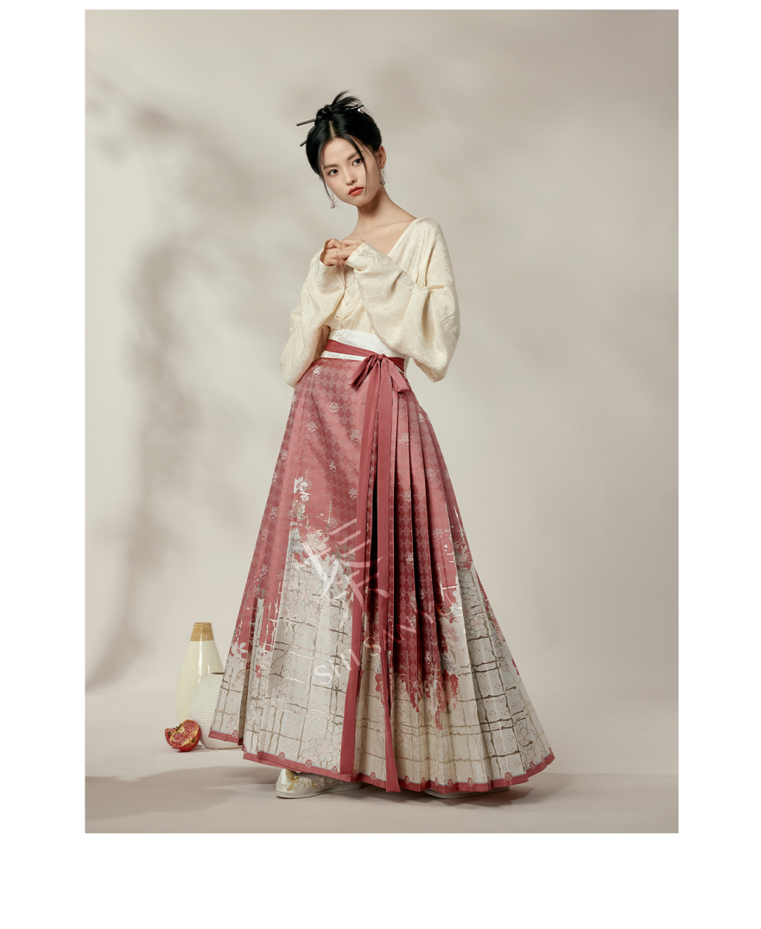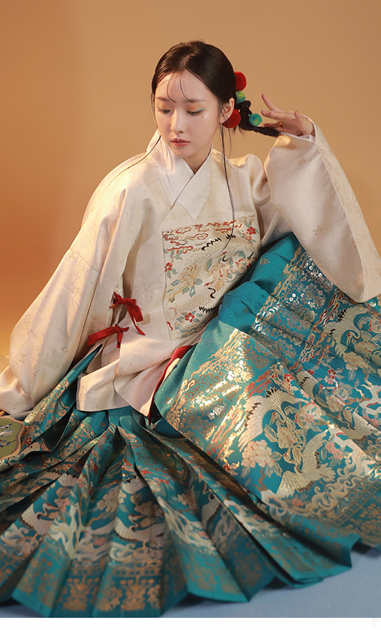 能夠完美提高腰線比例,突顯身材比例馬面裙整體穿搭形成強(qiáng)烈色彩對比
