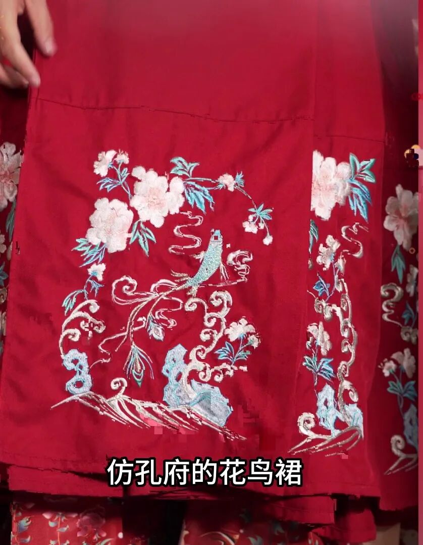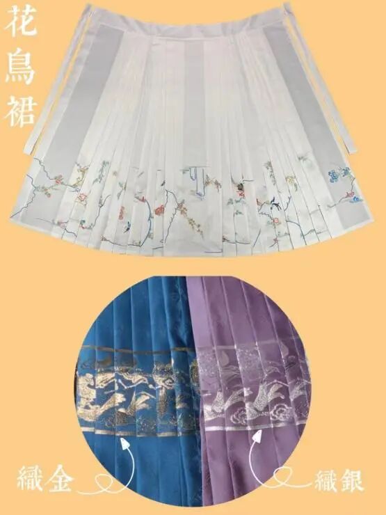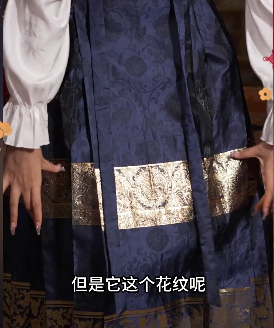 繡花馬面就是純色有繡花呀。其中最出名的當然是花鳥裙啦~一般來說,繡花是均勻的繡在裙子上。只在裙門大面積繡花的是清元素。