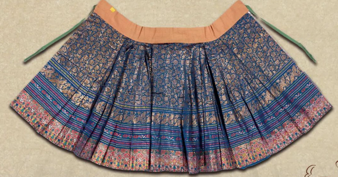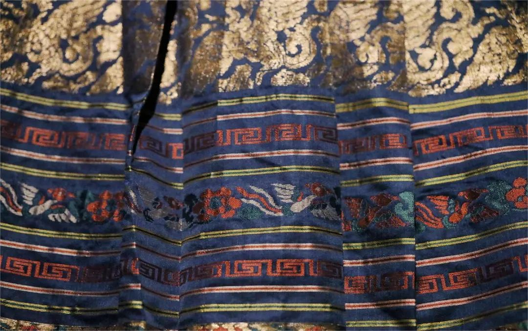 作為中國(guó)古代女子的主要裙式之一,馬面裙早在宋代就已初具雛形,明時(shí)尤為流行。馬面裙前后共有四個(gè)裙門(mén),兩兩重合、側(cè)面打裥,中間裙門(mén)重合而成的光面俗稱(chēng)馬面。明代馬面裙往往裝飾有裙襕,紋飾多樣且寓意豐富:例如龍鳳象征吉祥和美好姻緣,牡丹代表富貴,菊花則代表益壽延年。