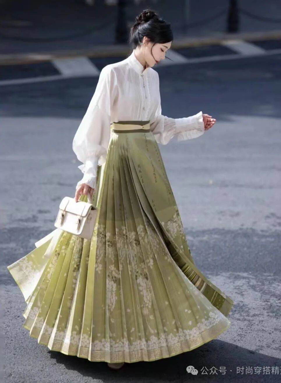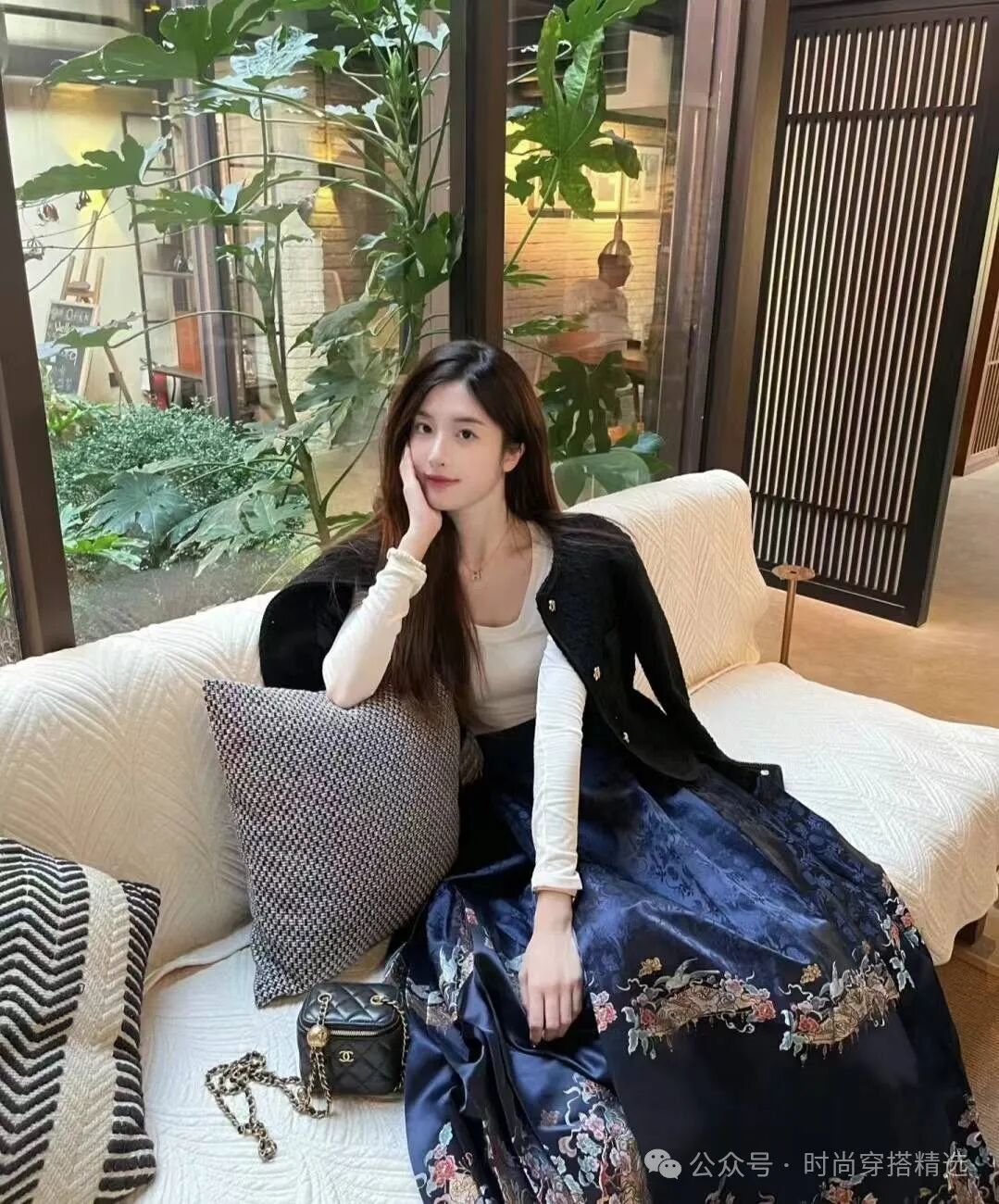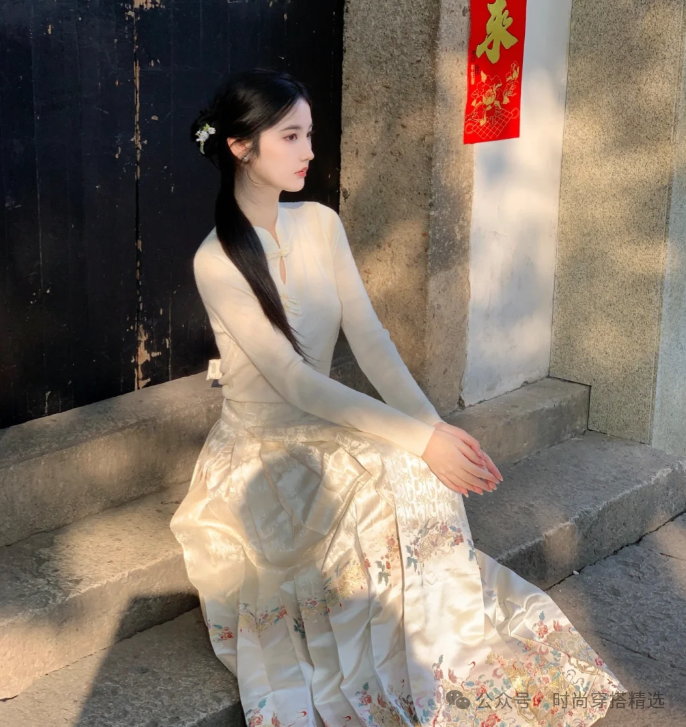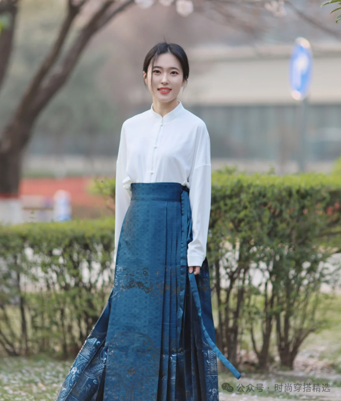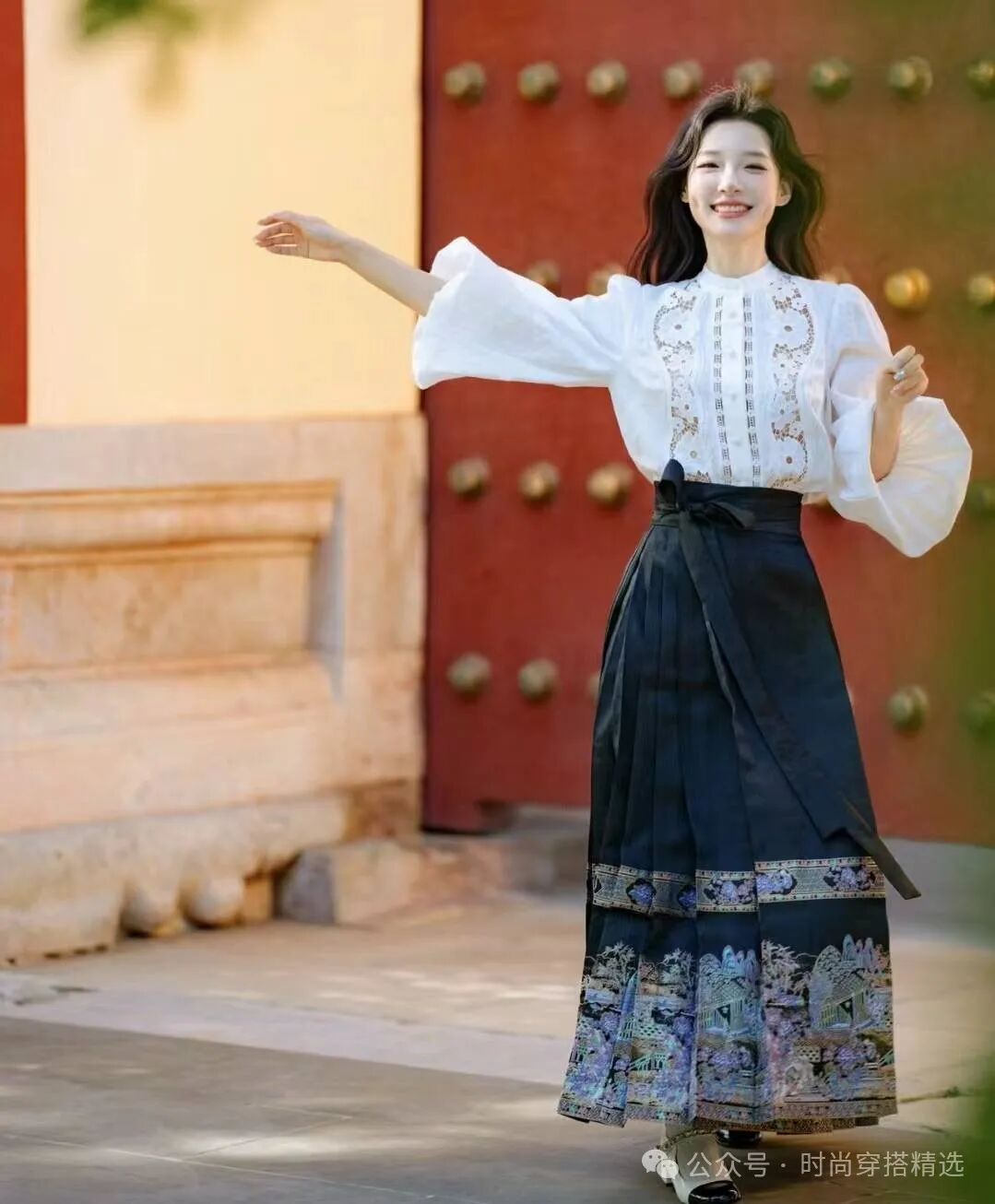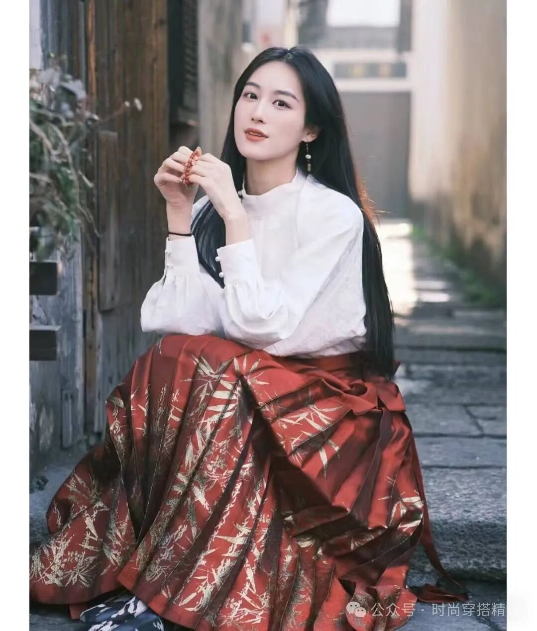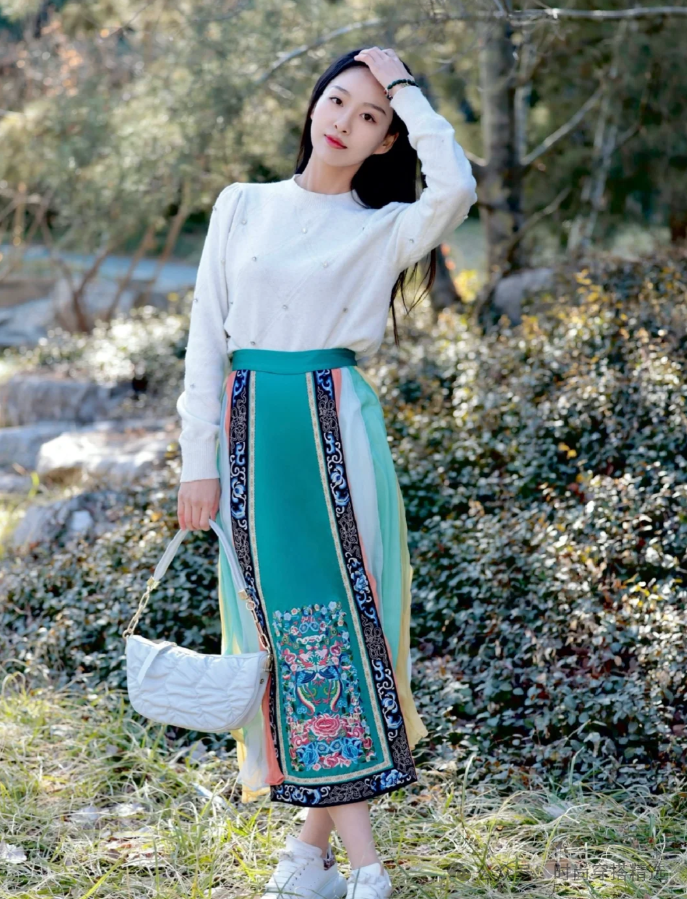 例如,簡約風格的白色襯衫搭配色彩艷麗的馬面裙,既能凸顯出馬面裙的優雅韻味,又能展現出都市女人的干練與自信。或者選擇寬松的針織衫搭配素色馬面裙,營造出一種慵懶而文藝的復古氛圍。