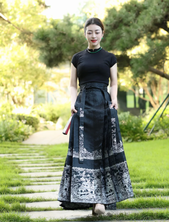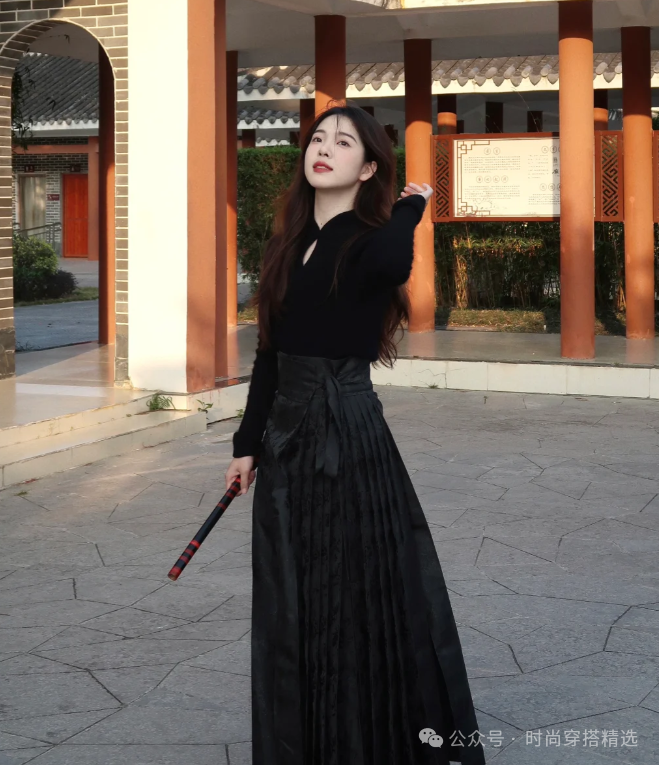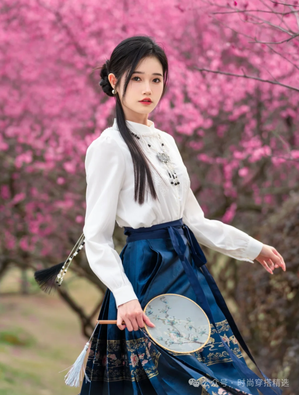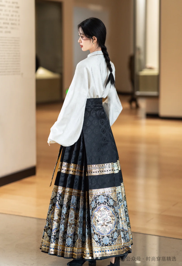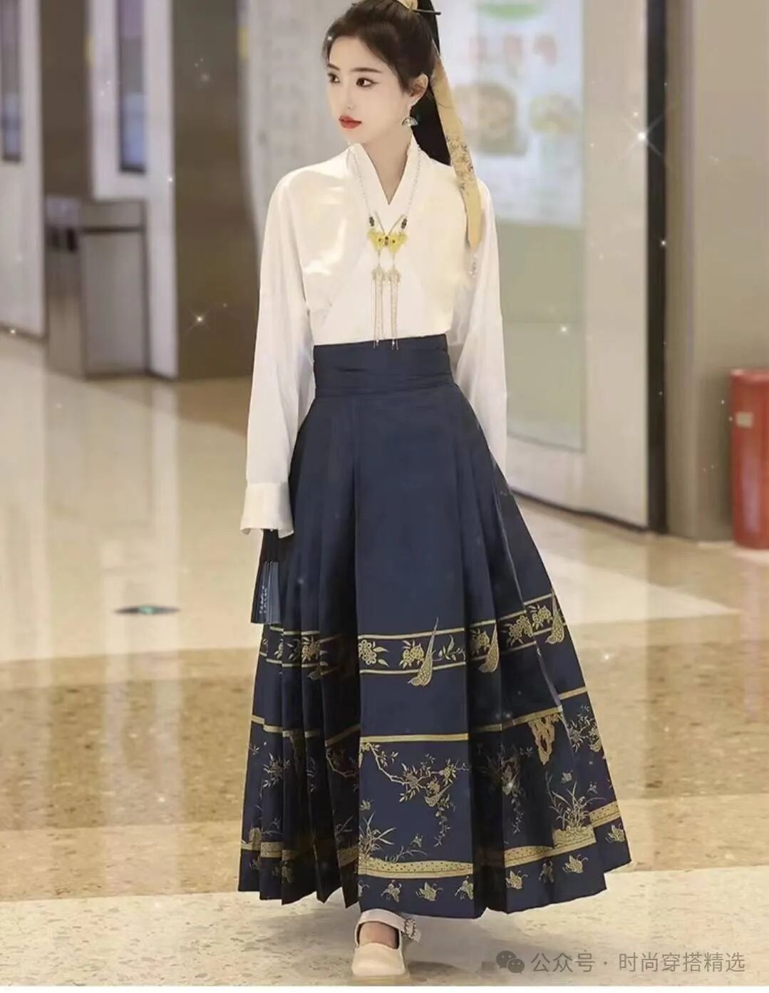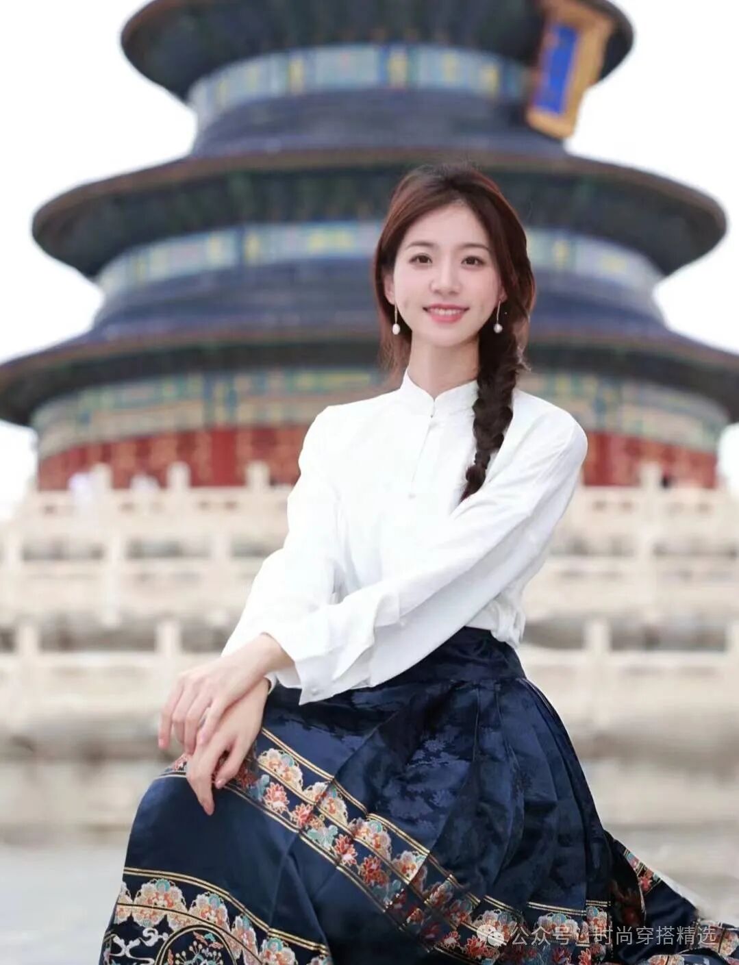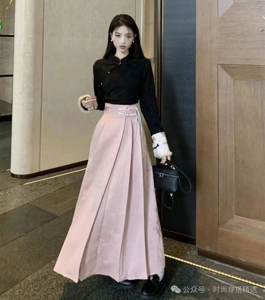 例如,簡約風格的白色襯衫搭配色彩艷麗的馬面裙,既能凸顯出馬面裙的優雅韻味,又能展現出都市女人的干練與自信。或者選擇寬松的針織衫搭配素色馬面裙,營造出一種慵懶而文藝的復古氛圍。