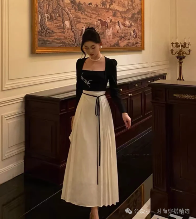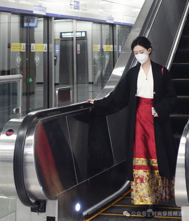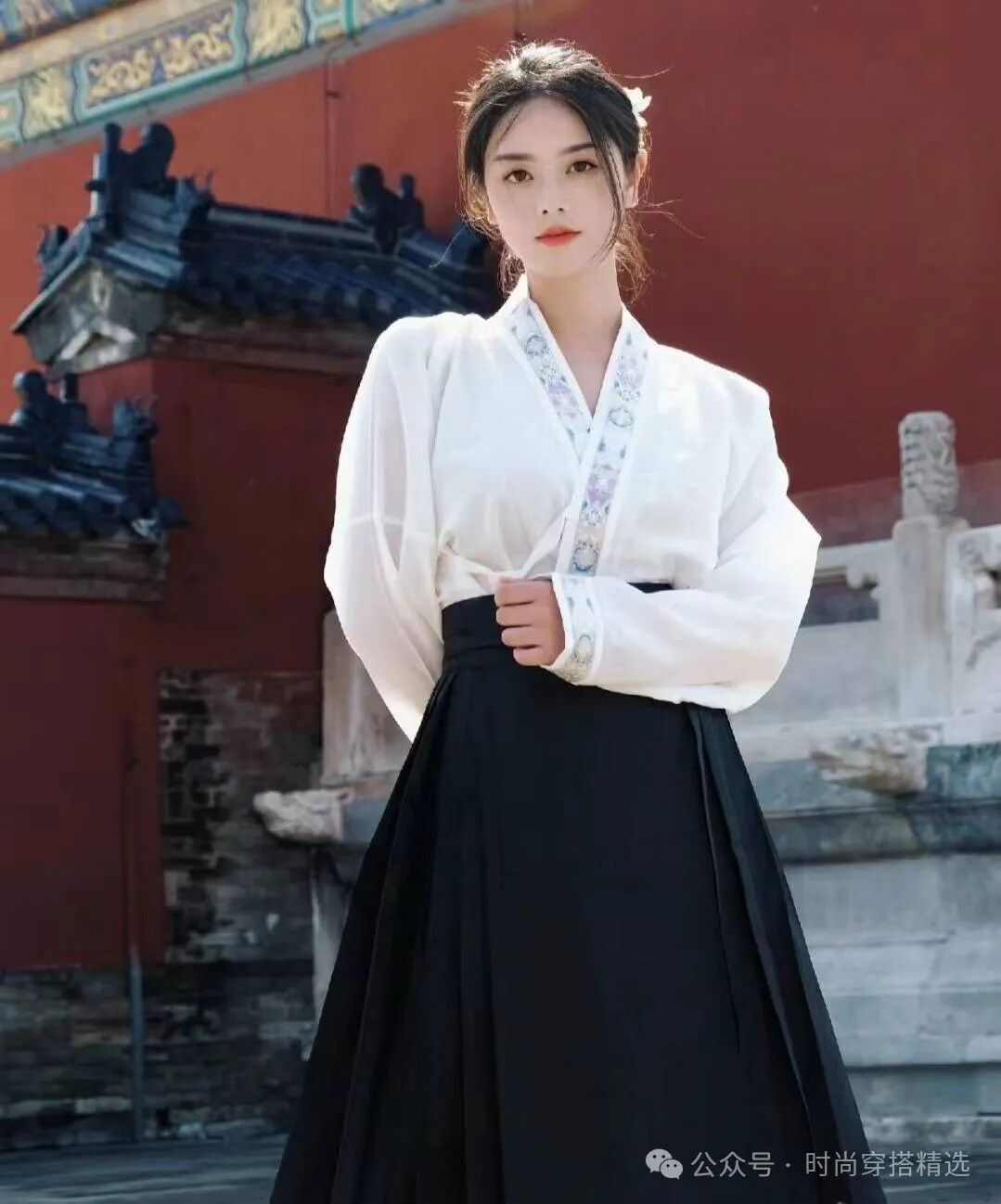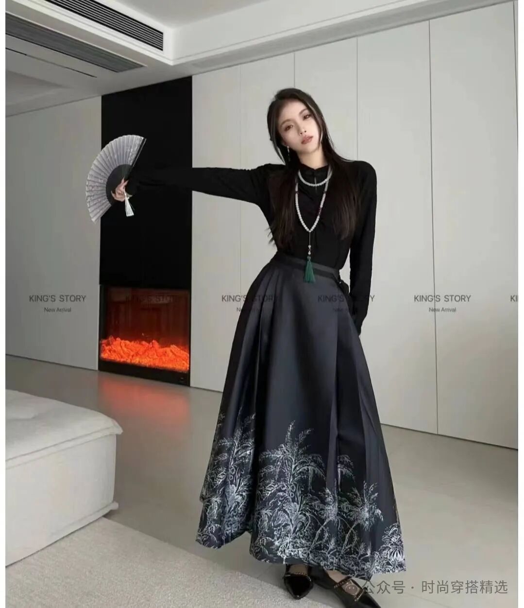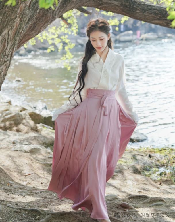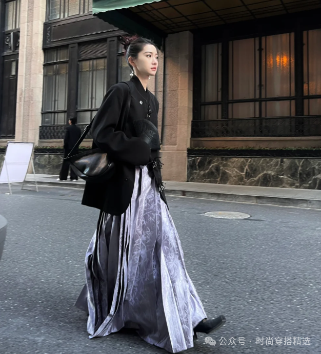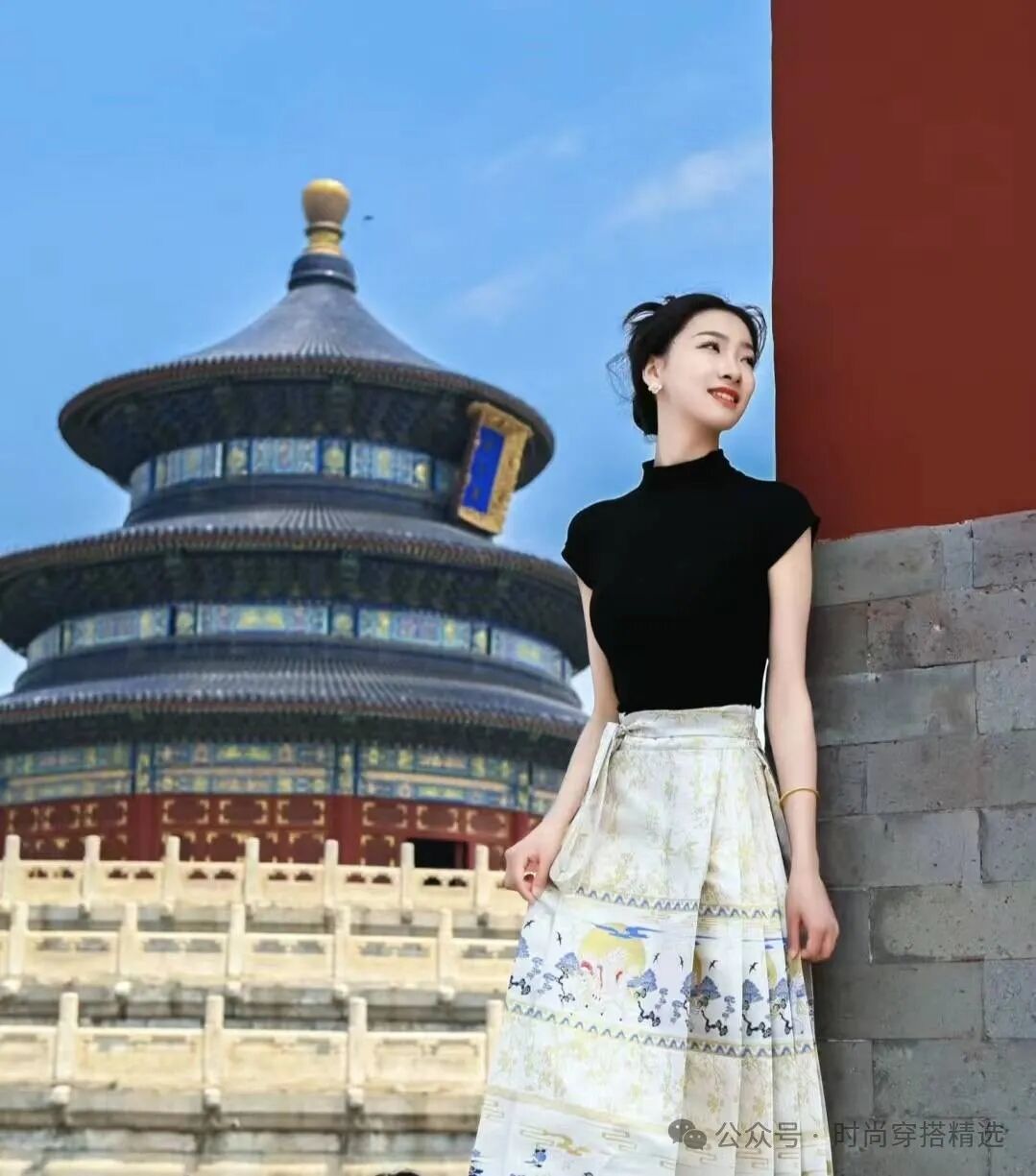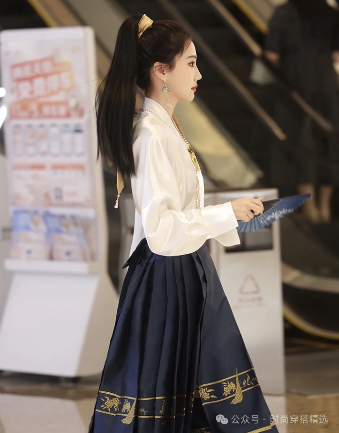 例如,簡約風格的白色襯衫搭配色彩艷麗的馬面裙,既能凸顯出馬面裙的優雅韻味,又能展現出都市女人的干練與自信。或者選擇寬松的針織衫搭配素色馬面裙,營造出一種慵懶而文藝的復古氛圍。
