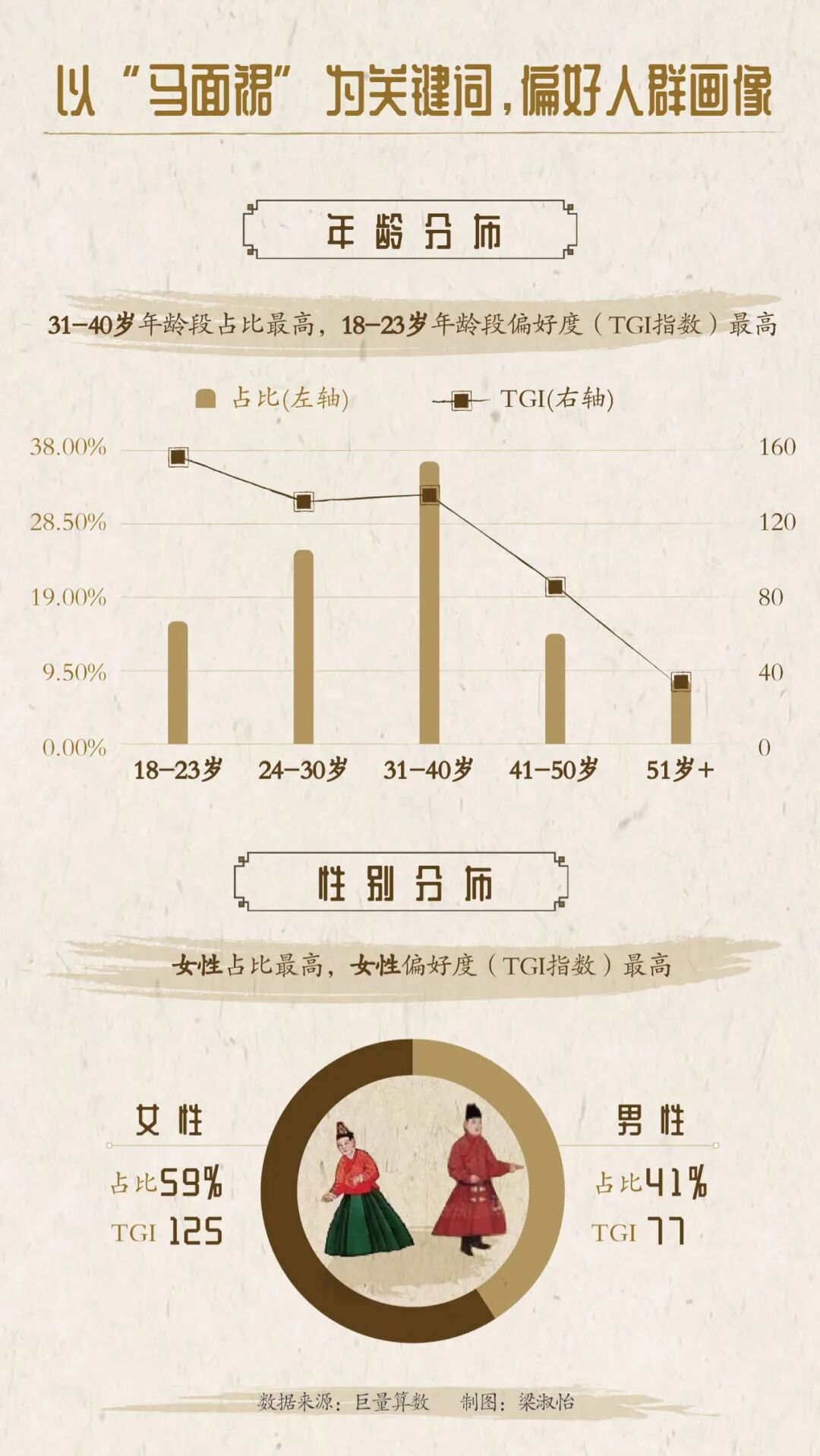 從現有數據不難看出,中式審美獲得了大眾高度一致的認同。馬面裙的主要消費者為年輕女性,這是情理之中。然而,令人意想不到的是,據統計,觀看馬面裙、漢服、新中式相關視頻的男性群體也不在少數。