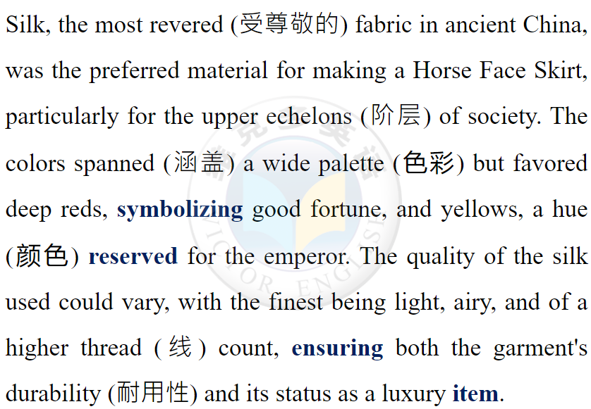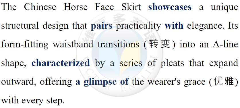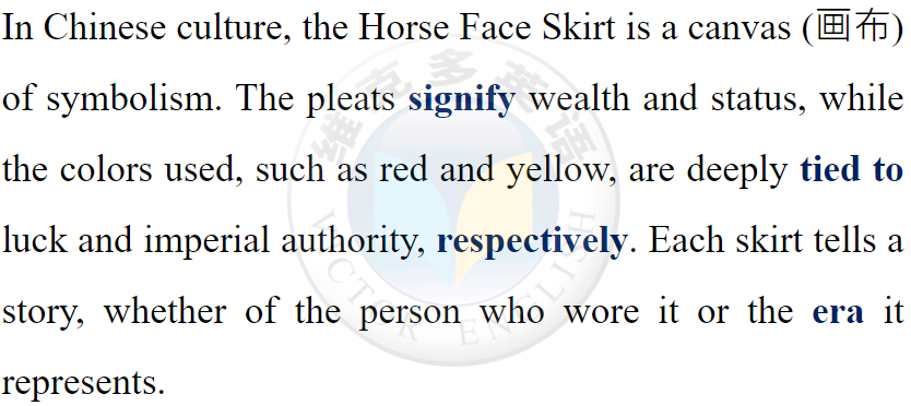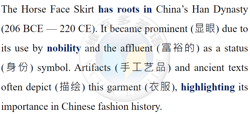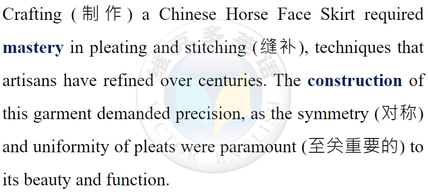 The Horse Face Skirt is not just a piece of clothing but a rich tapestry (織錦) of Chinese heritage. It encapsulates (概括) the values, aesthetics (美學), and social norms of the times it adorned (裝飾).