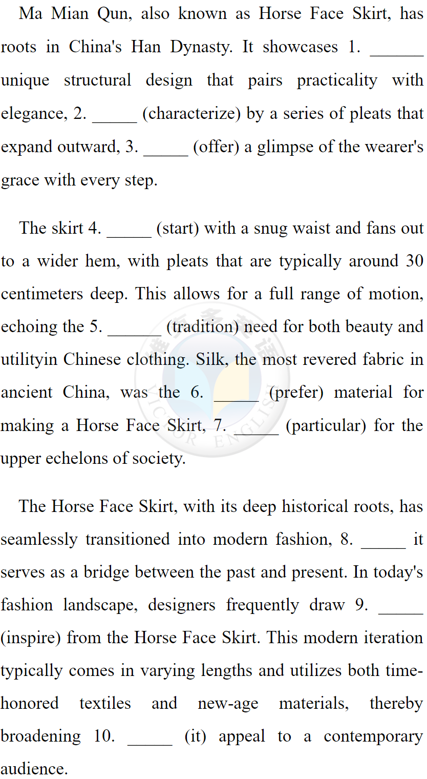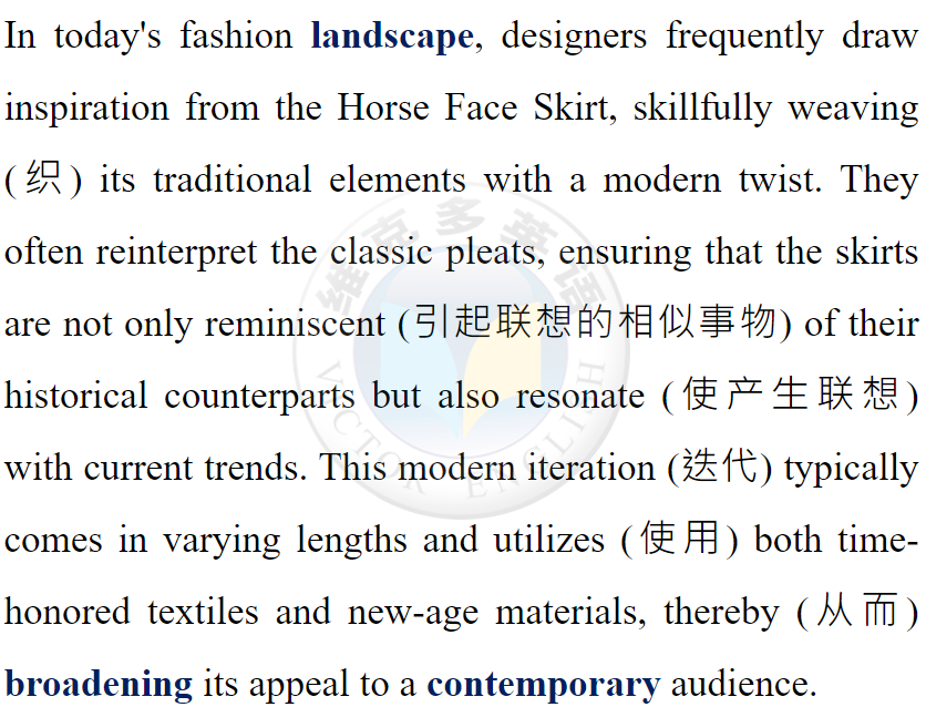 The Horse Face Skirt, with its deep historical roots, has seamlessly (無縫地) transitioned into modern fashion, where itserves asa bridge between the past and present.
