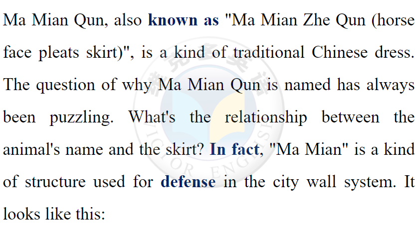 馬面裙,又稱馬面褶裙,是一種中國傳統服飾。馬面裙的命名一直是個令人費解的問題。動物的名字和裙子有什么關系?其實,馬面是城墻系統中用于防御的一種結構。它是這樣的: