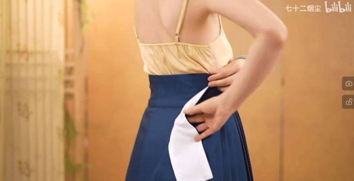 對于沒有打孔的馬面裙,在穿著時將兩片圍攏后,里片稍微上提,把系帶拉出來。