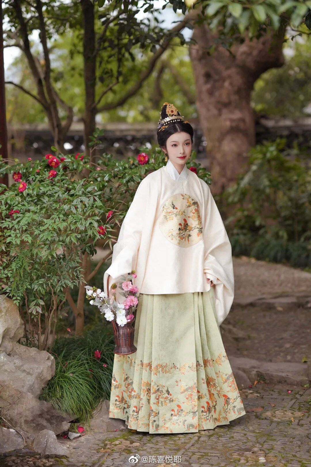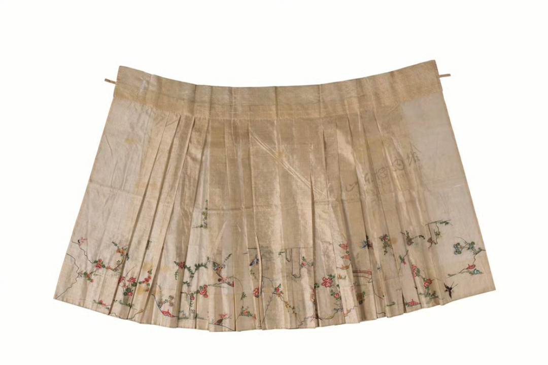 白色暗花紗繡花鳥紋裙也是明制漢服的經典單品。無論從結構、材質或是審美方面,都詮釋了明代中后期的馬面裙風尚。