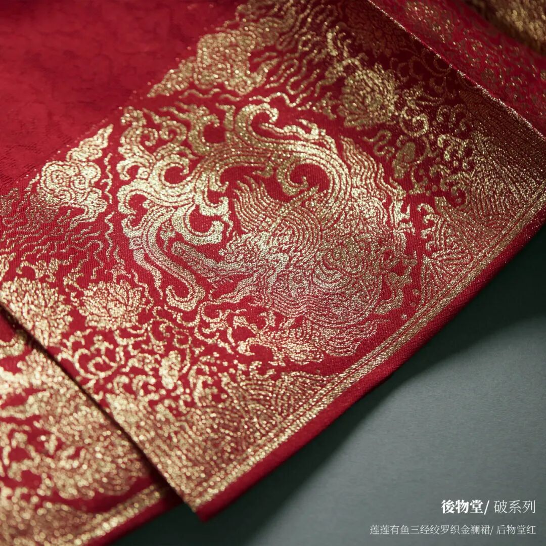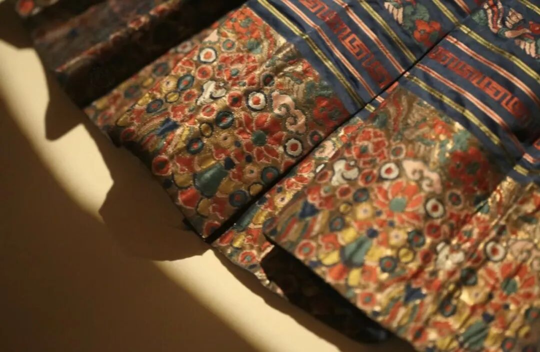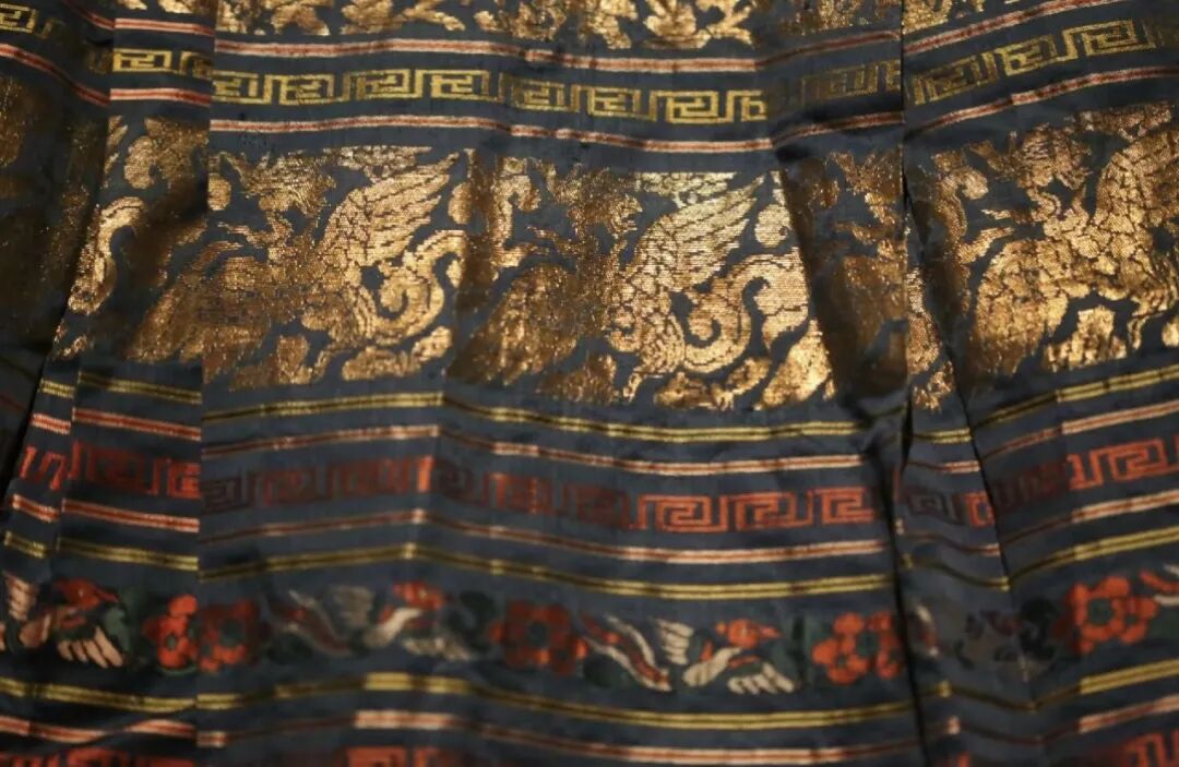 裙擺處以五彩絲線挖織鳳穿牡丹和蓮花瓔珞紋,織物用色十分注重對金線的運用。