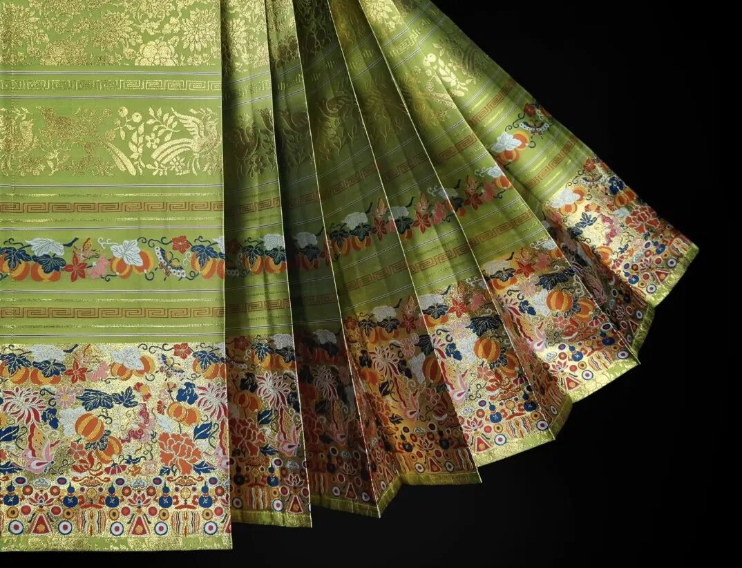 有一條被稱為明代傳世馬面裙標桿的妝花馬面裙,裙面點綴了各式各樣的妝花紋飾,上部為織金纏枝四季花紋,下部有三道裙襕,從上至下為織金鸞鳥紋、花翟紋和鈴鐸羽葆紋。