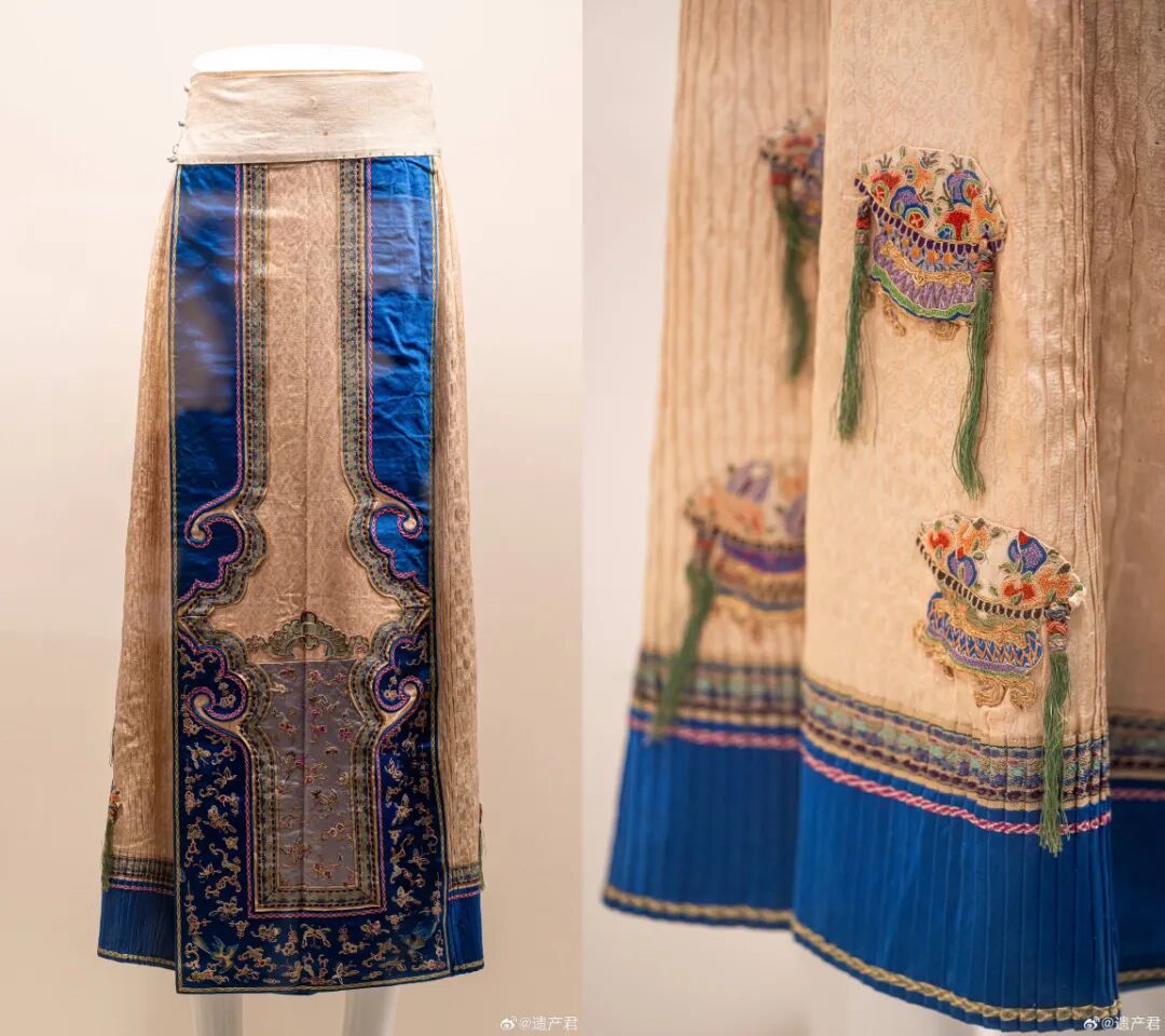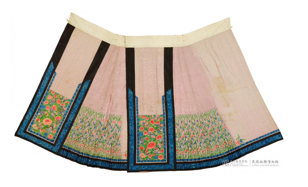 明代馬面裙在形制上并不復雜,兩側打褶,以舒適為主,因此在裝飾風格上偏向于清新雅麗。到了清代,漢人女子在樣式上承接明代,而馬面和裙襕的裝飾變得較為繁復,褶子細密,褶子之間還有鑲邊,衍生出百褶裙、襕干裙、鳳尾裙等多種形制。