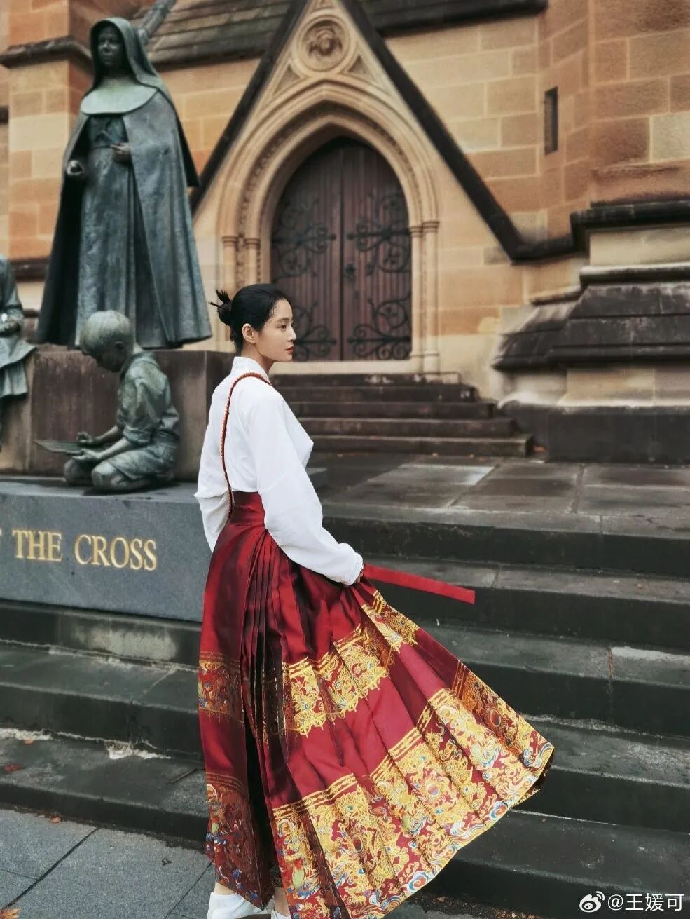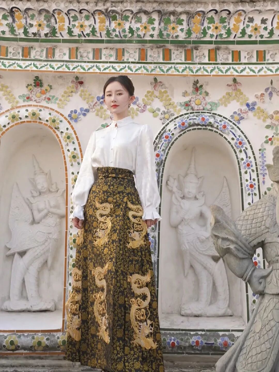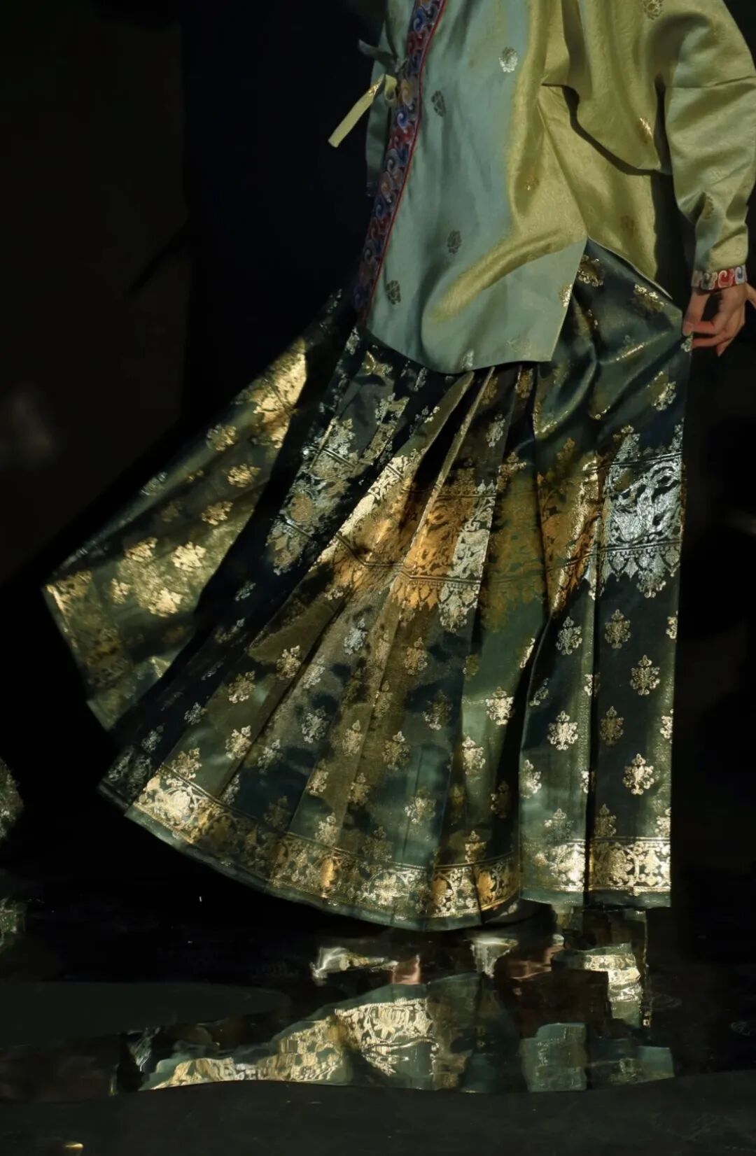 傳統馬面裙穿法是上衣不扎進裙子里,遮肉顯瘦效果極佳,馬面裙兩側的褶裥可以修飾胯部。