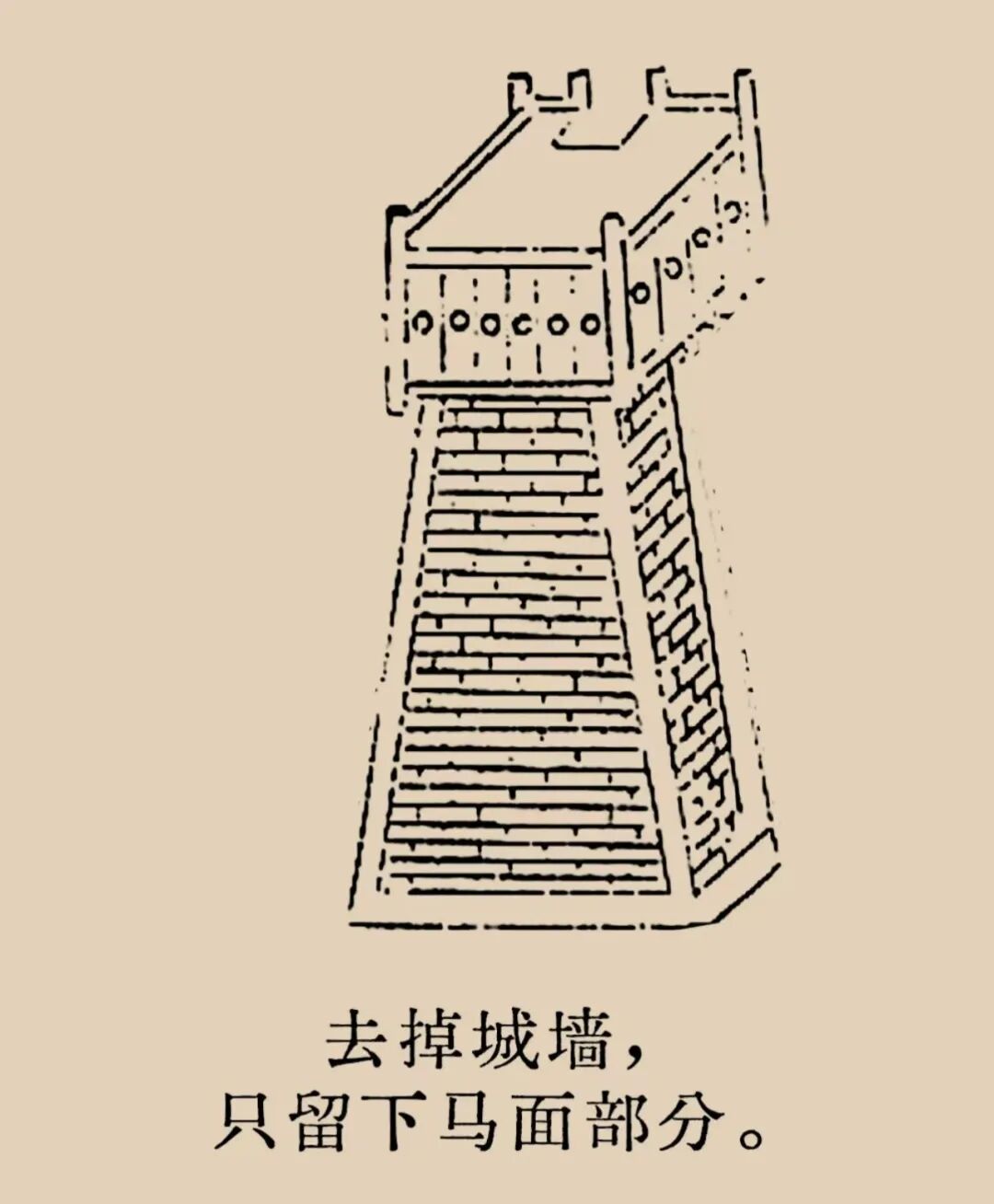這里并非指動物的馬,而是形似古代用于軍事防御的墩臺,名叫碼面。墩臺高聳突出,兩側有高低起伏、形似裙褶的防御墻;而墩臺的長方形外立面,與中間裙門形成的光面相似,馬面通假碼面,由此得名。