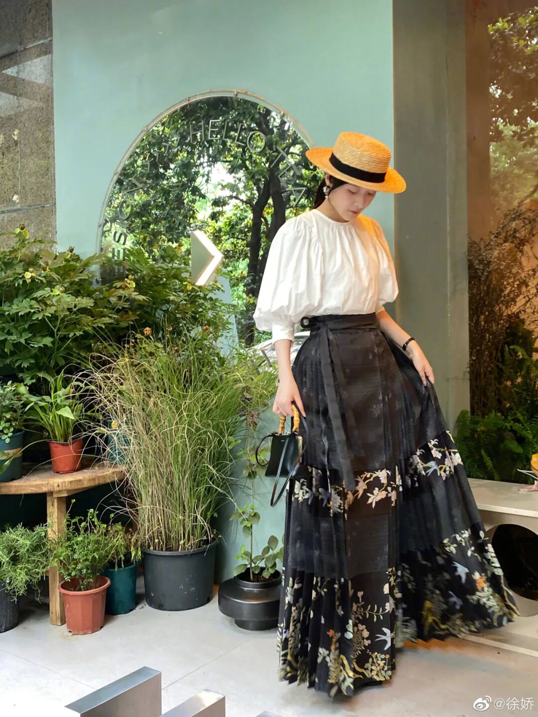 與現代服飾混搭之后,如果選擇將上衣扎進裙子,可以搭配腰封調整身材比例。